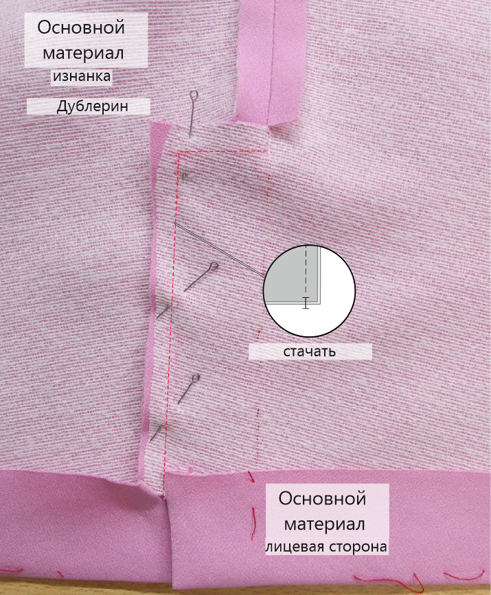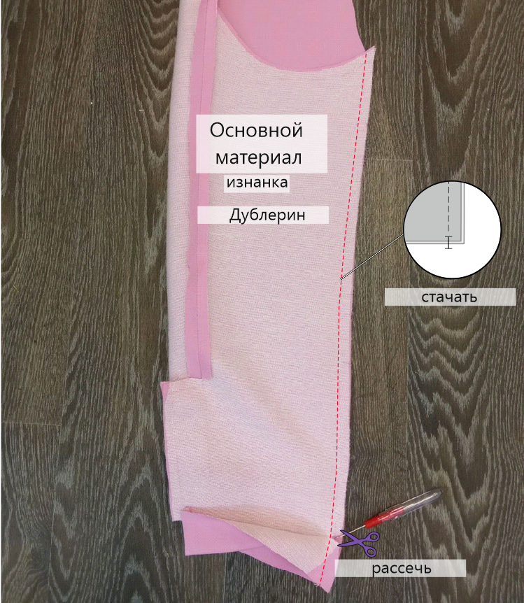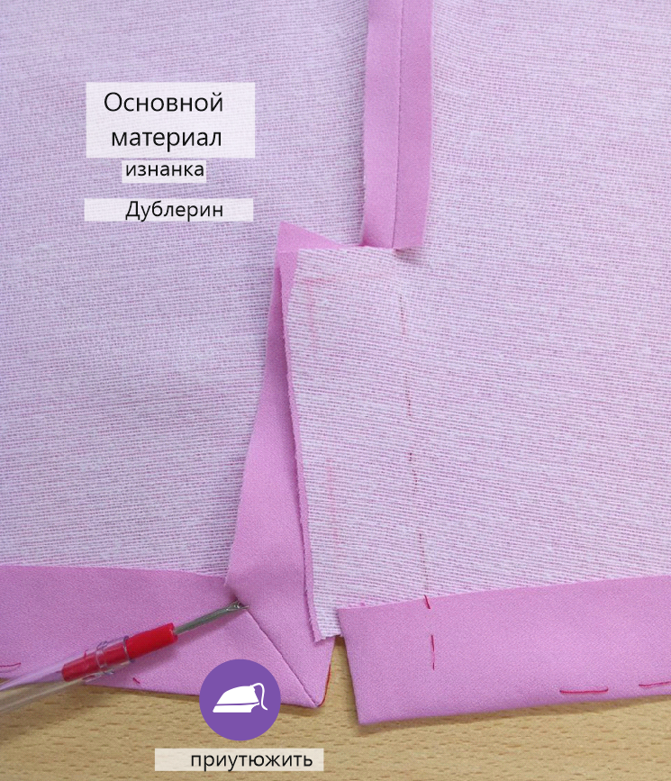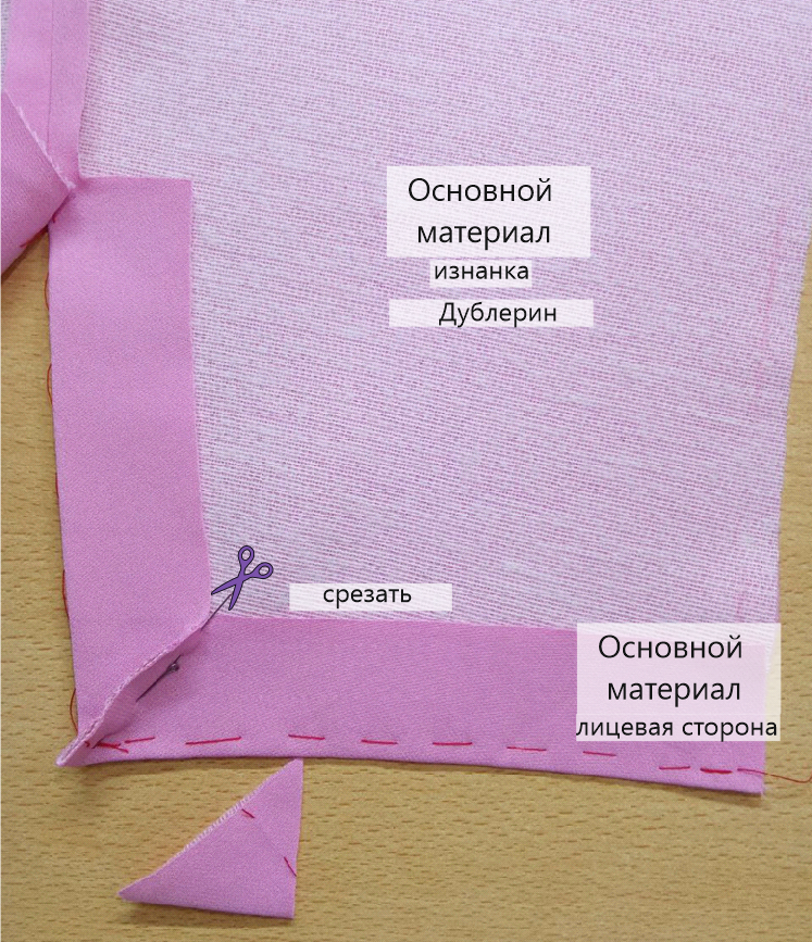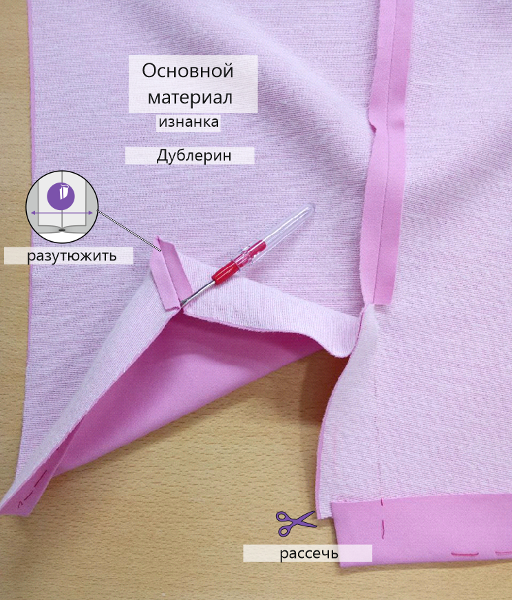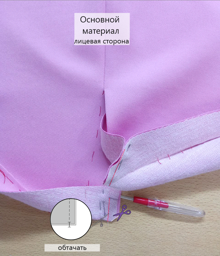 Заколите уголок шлицы по заутюженным линиям. Оставьте припуски на швы на обтачивание уголка, остальное срежьте.