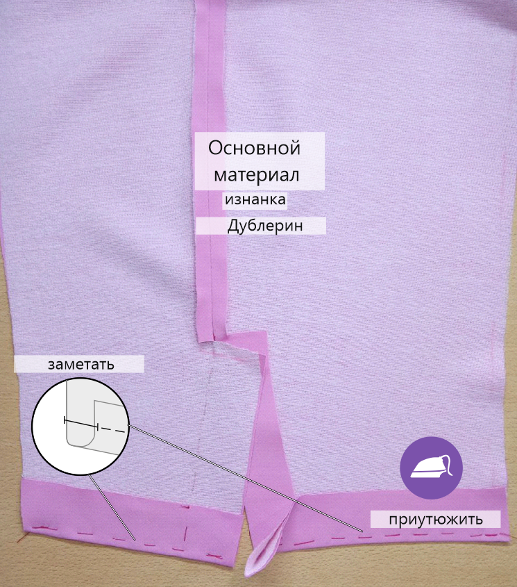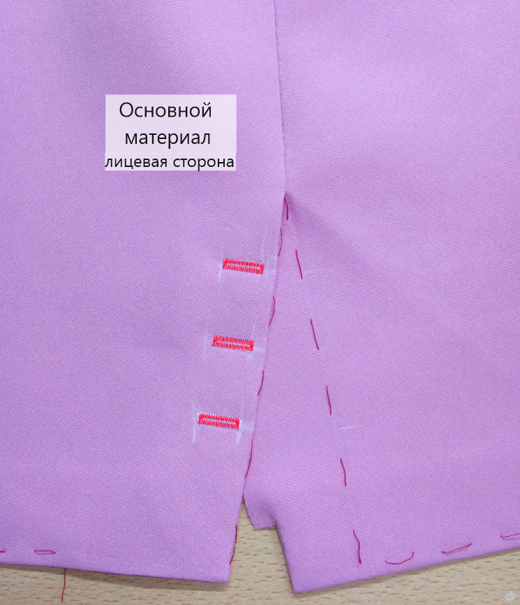 Обтачайте концы шлицы, не доходя до срезов низа на 1 см. Припуски швов в уголках высеките наискосок, не доходя до строчки 0,2 см.