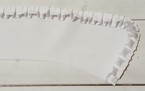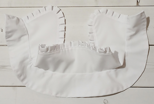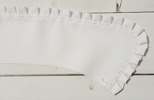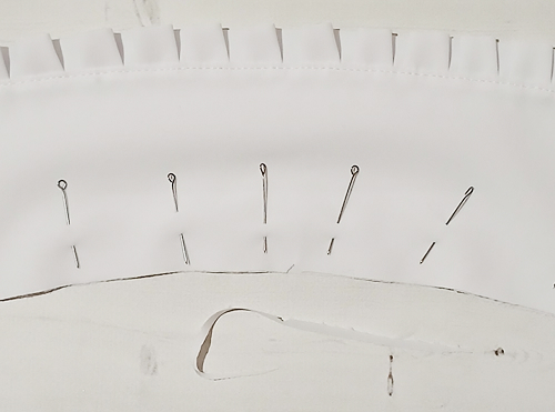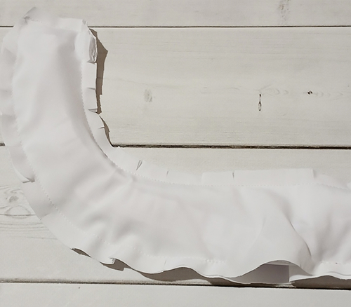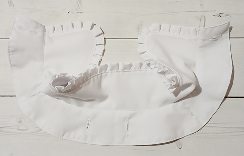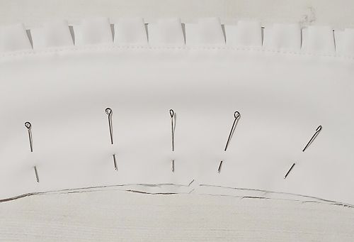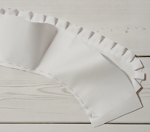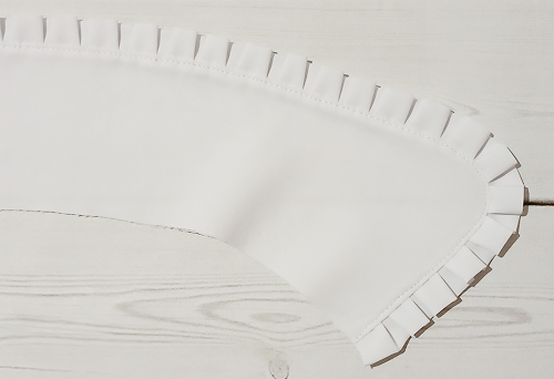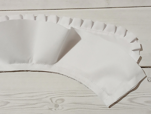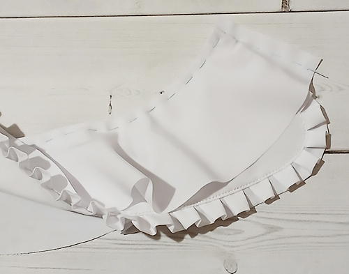 Наложите оборку на верхний воротник, лицом к лицу, уравнивая её срезы с внешним срезом воротника, приметайте, закладывая оборку мелкими складочками.