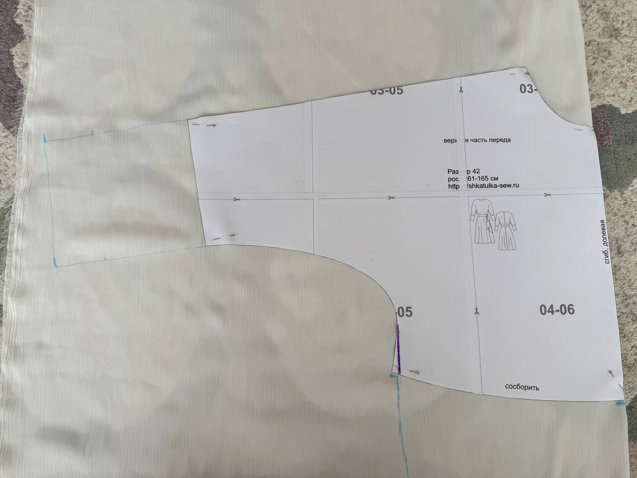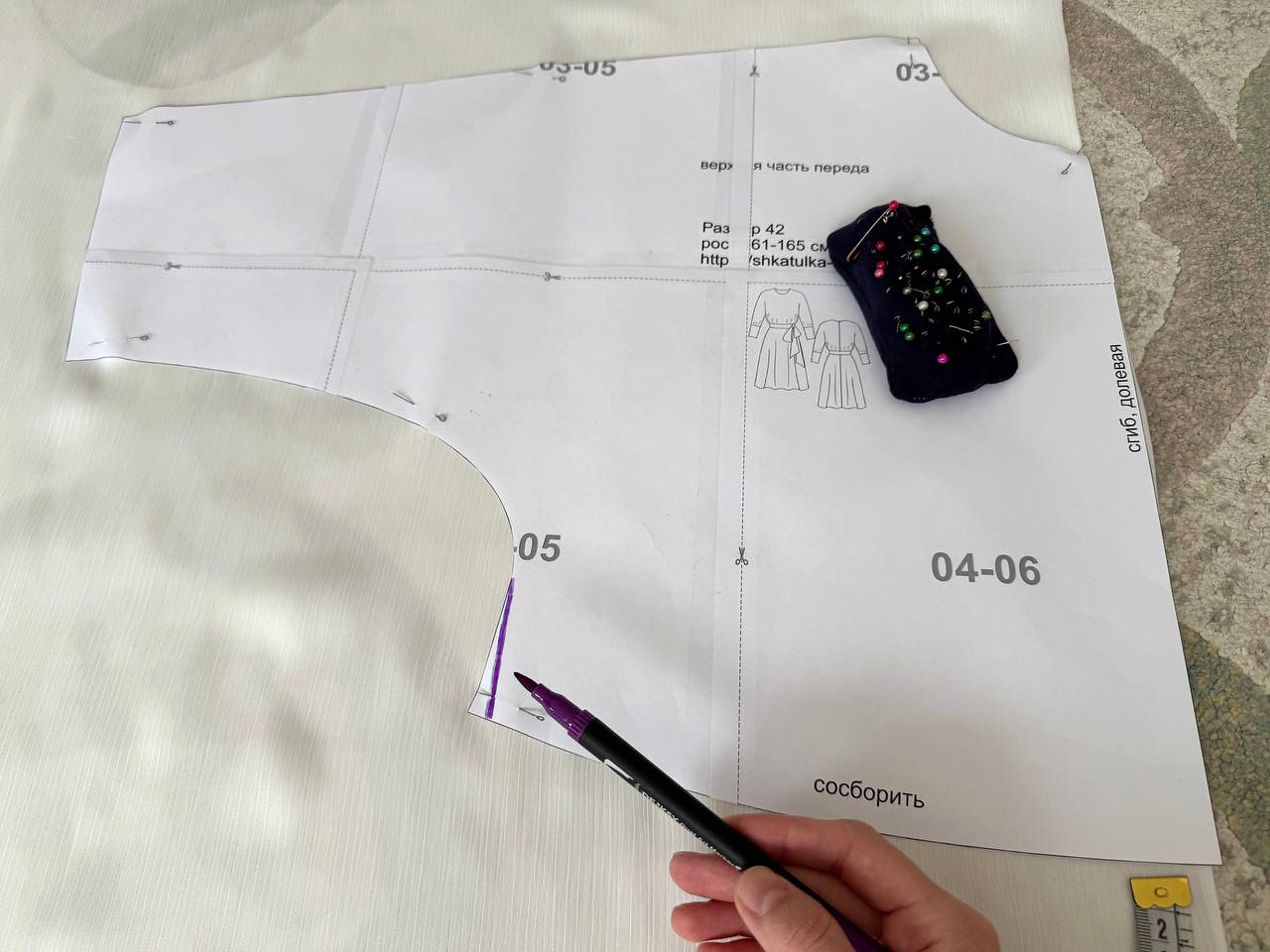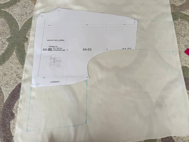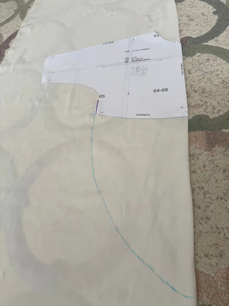 Укладываем деталь полочки на ткань. Выравниваем линию, идущую от рукава до талии, убирая расклешение. В 42 размере это примерно 1 см.