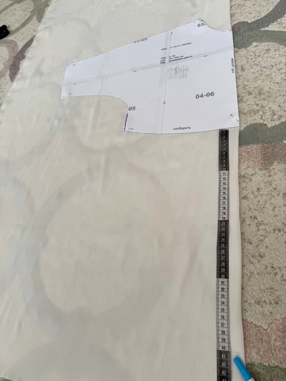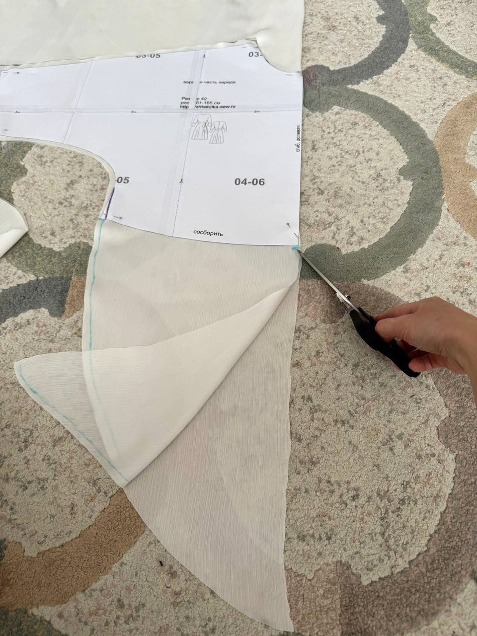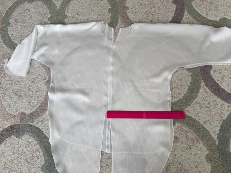 Укладываем деталь полочки на ткань. Выравниваем линию, идущую от рукава до талии, убирая расклешение. В 42 размере это примерно 1 см.