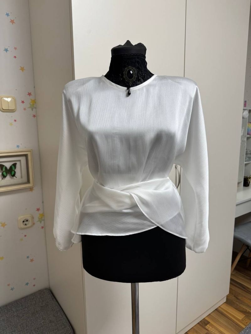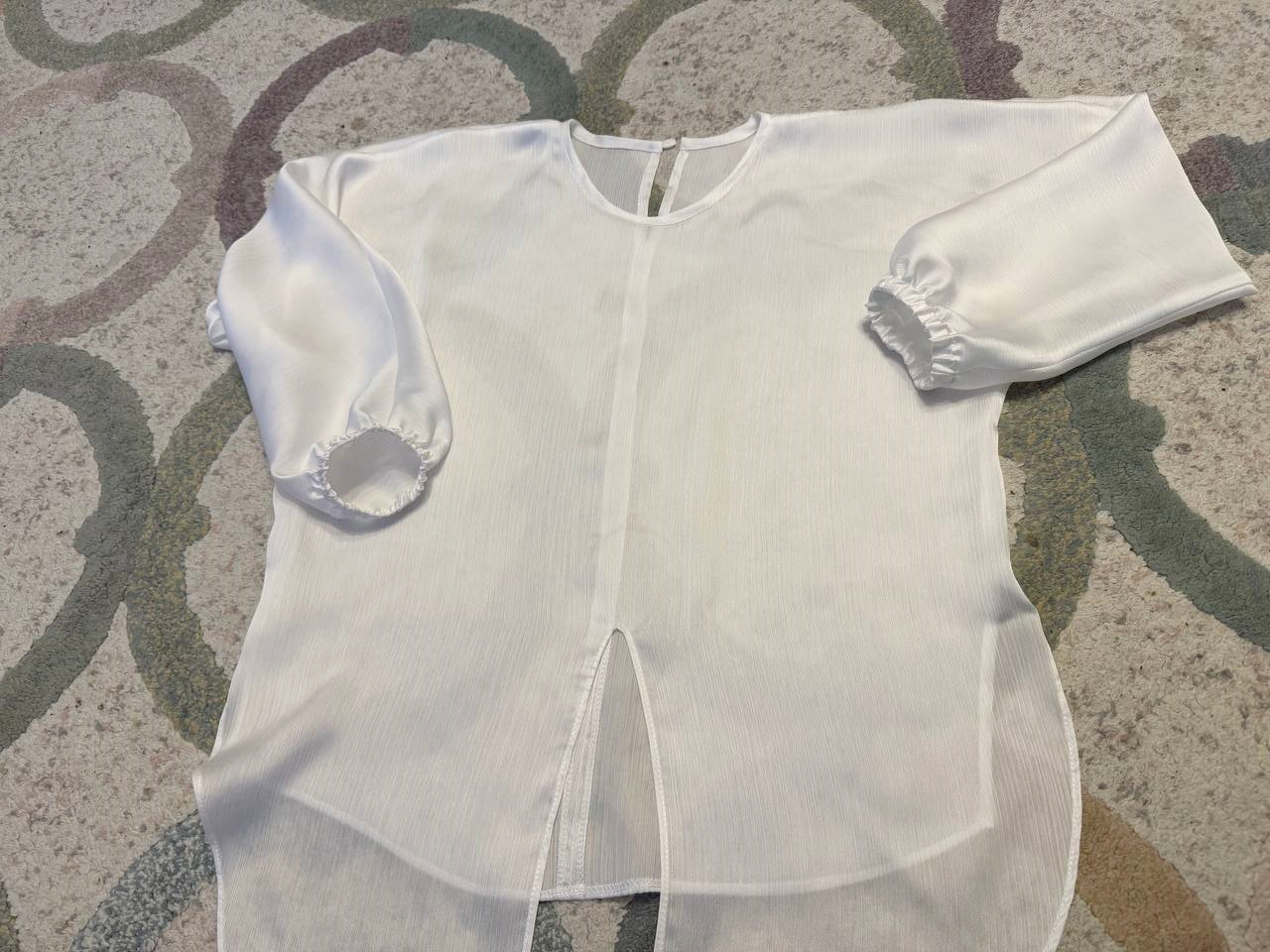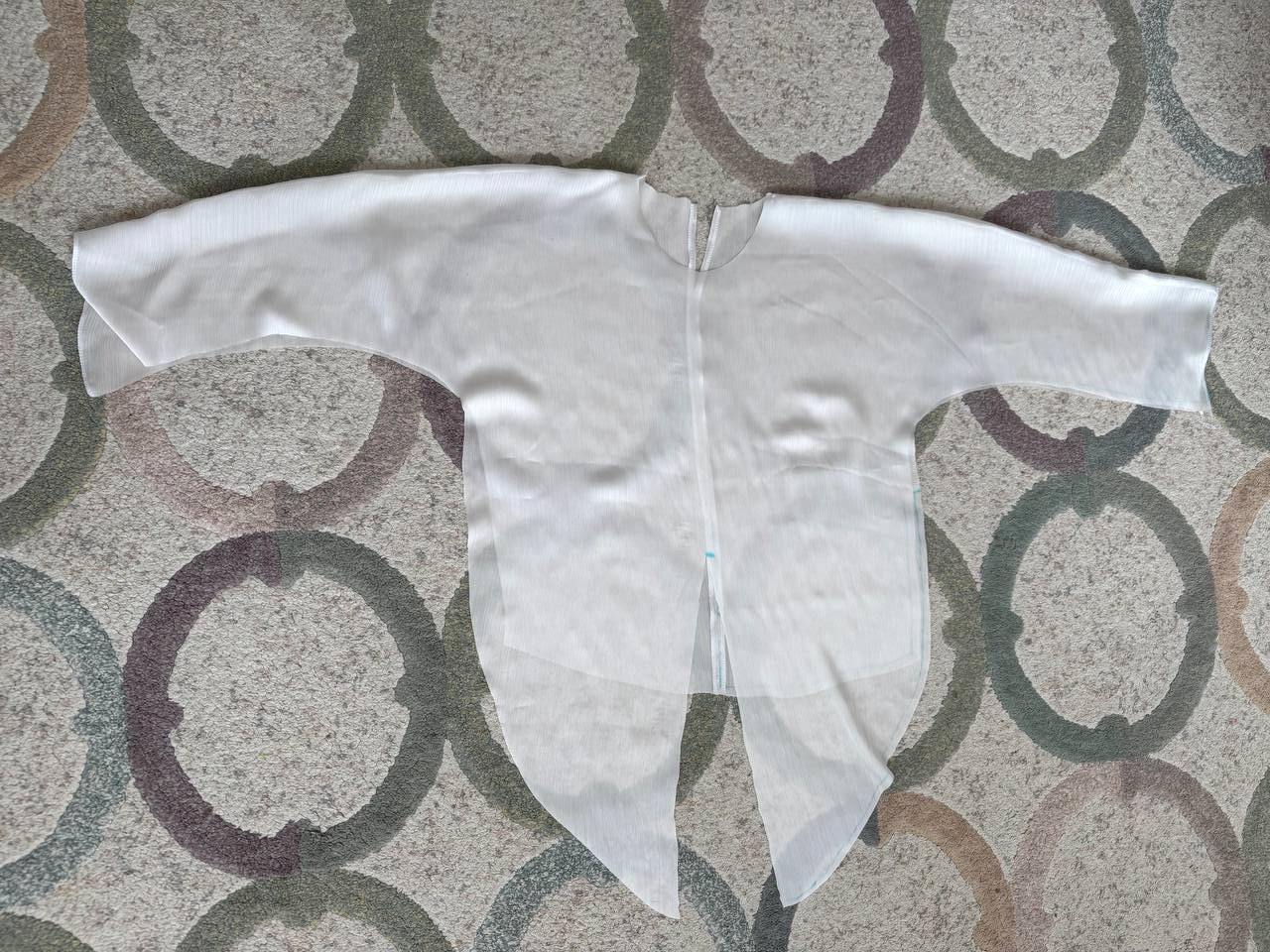 Блузка готова, осталось пришить пуговичку к разрезу горловины на спинке.