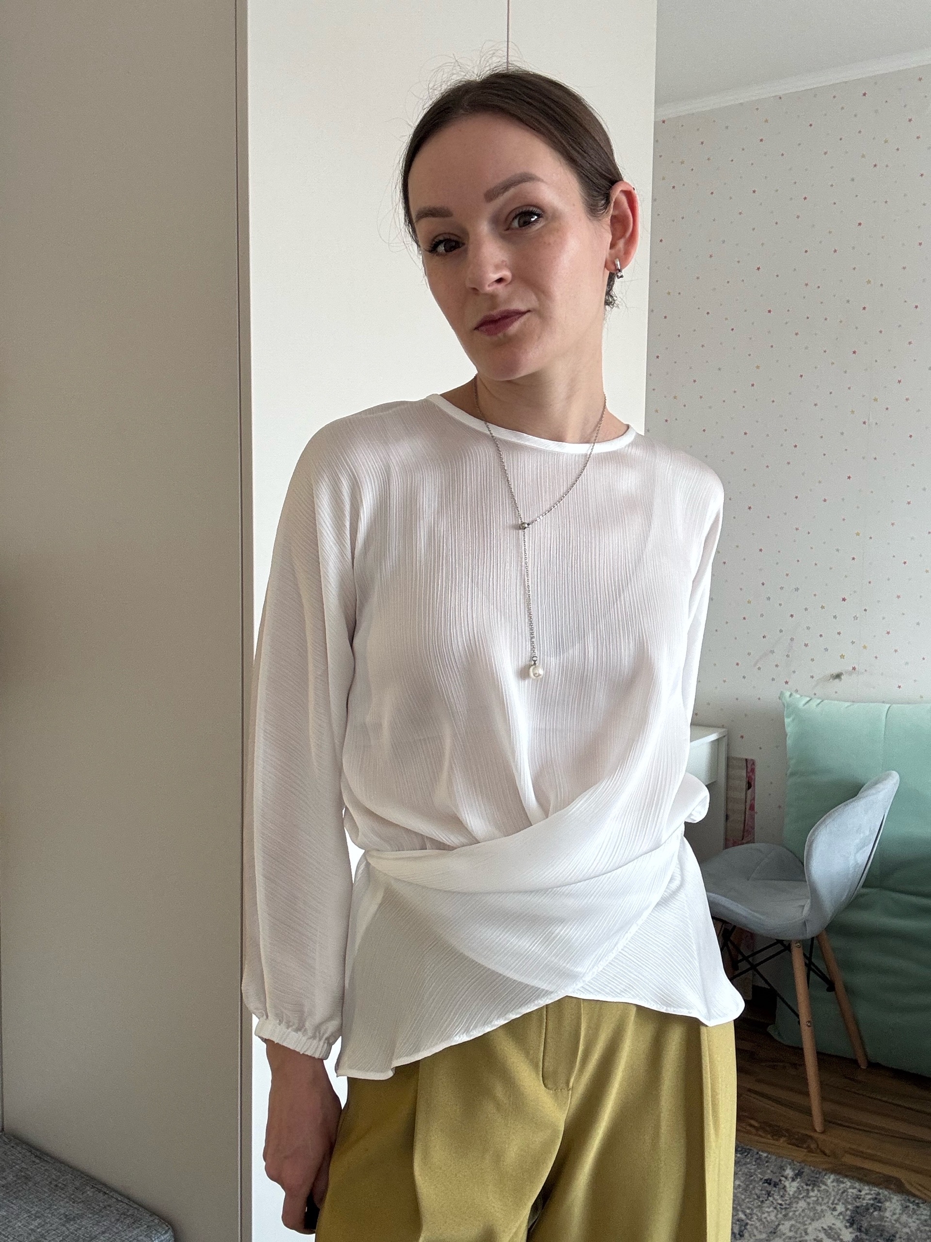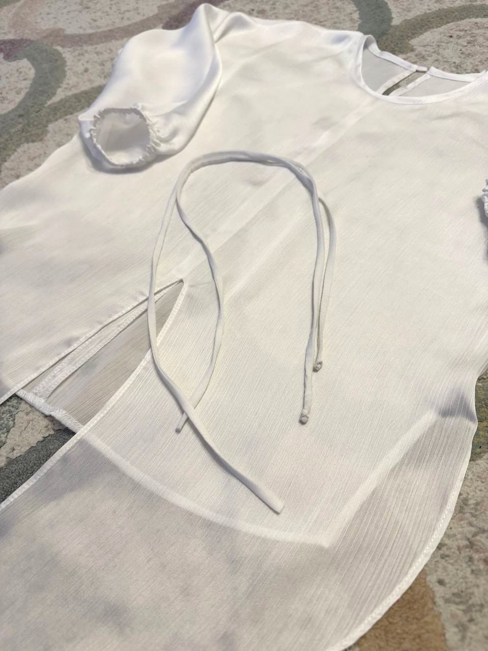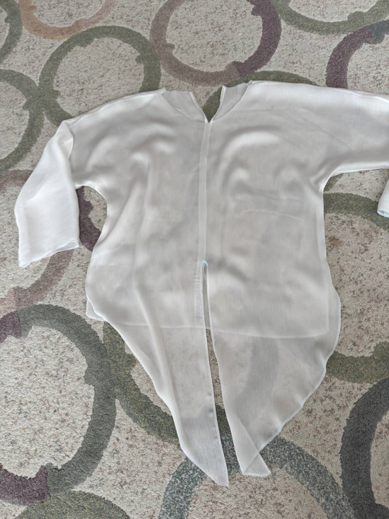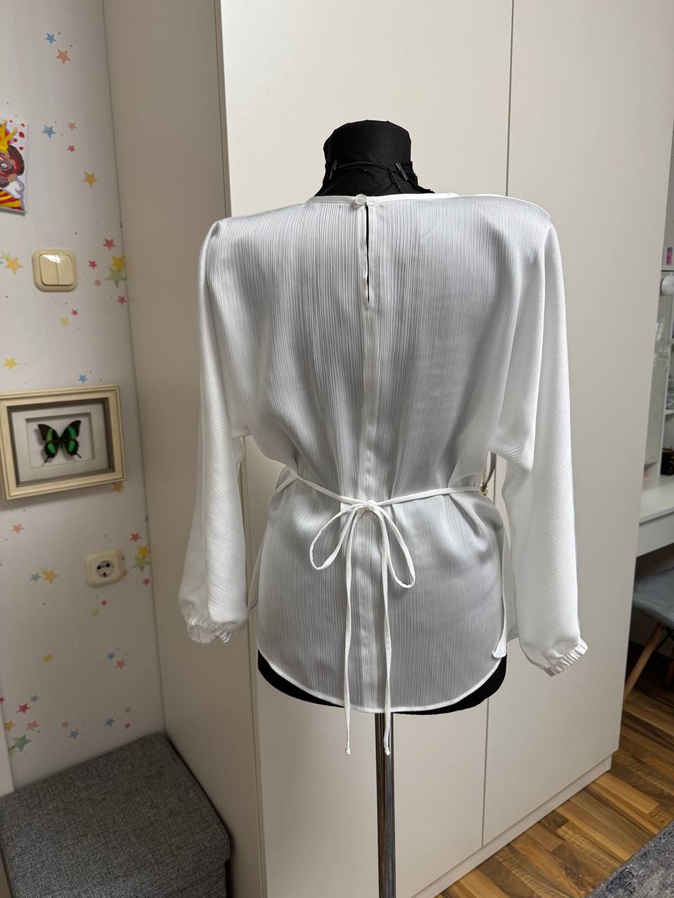 Блузка готова, осталось пришить пуговичку к разрезу горловины на спинке.