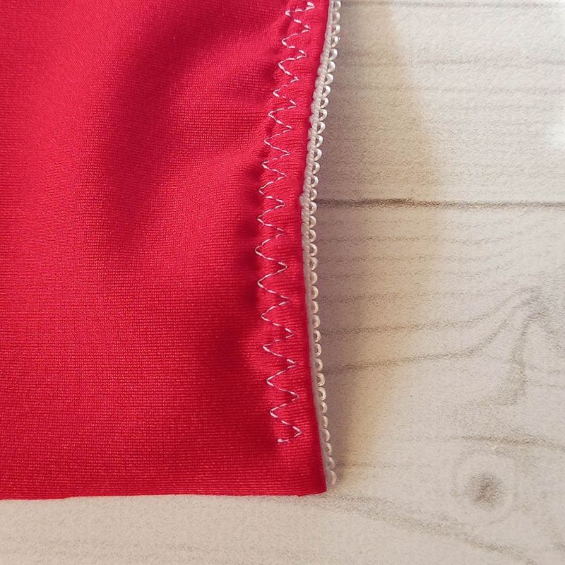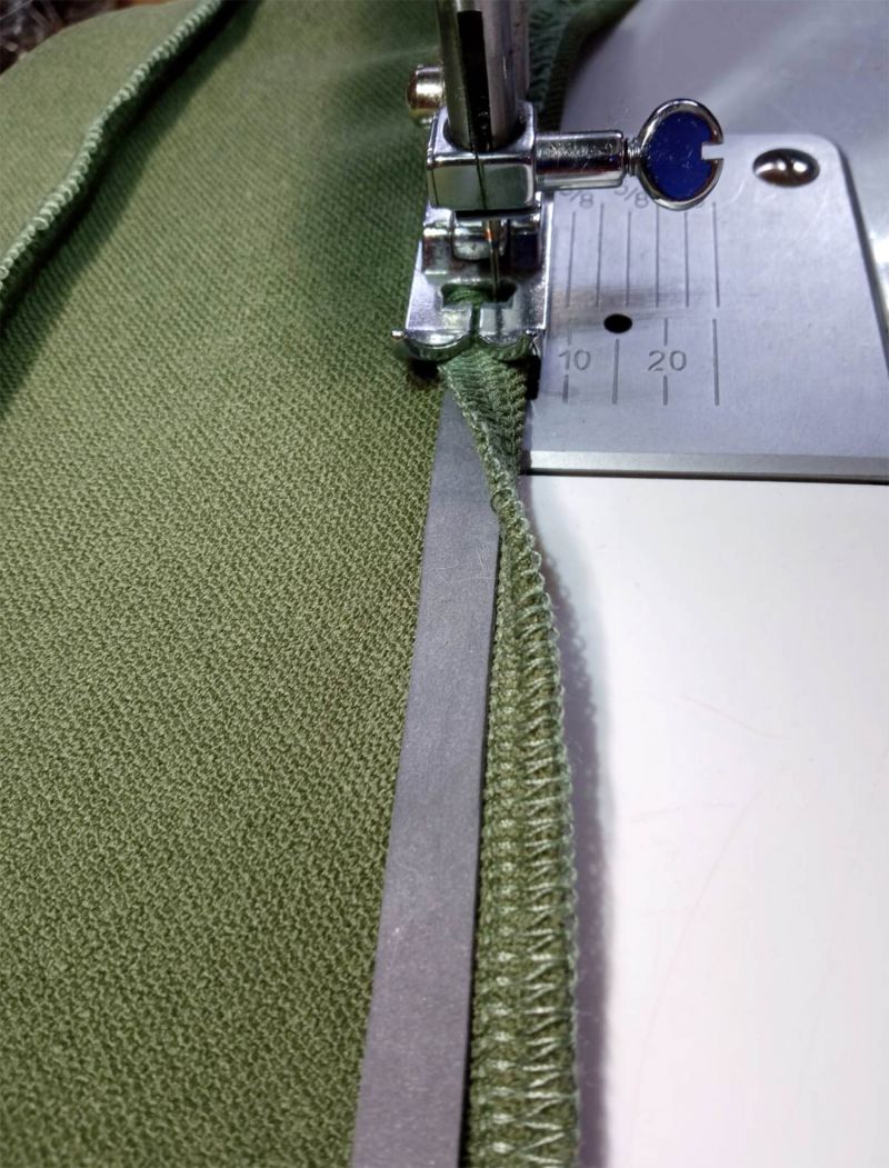 Притачайте бейку трёхступенчатым зигзагом. Обратите внимание: строчку нужно прокладывать, растягивая только бейку, но не полотно. В противном случае край изделия будет фалдить.