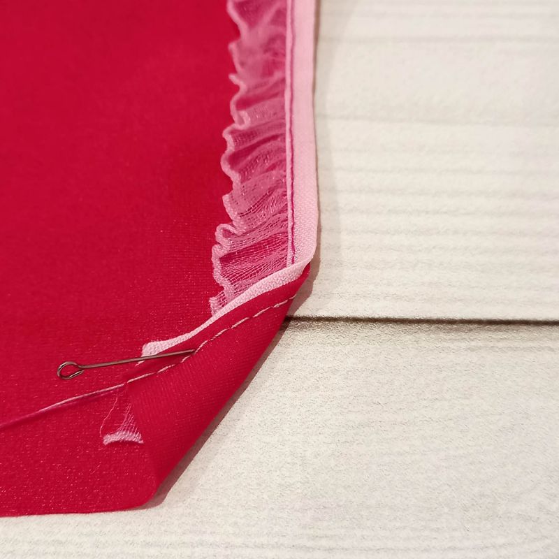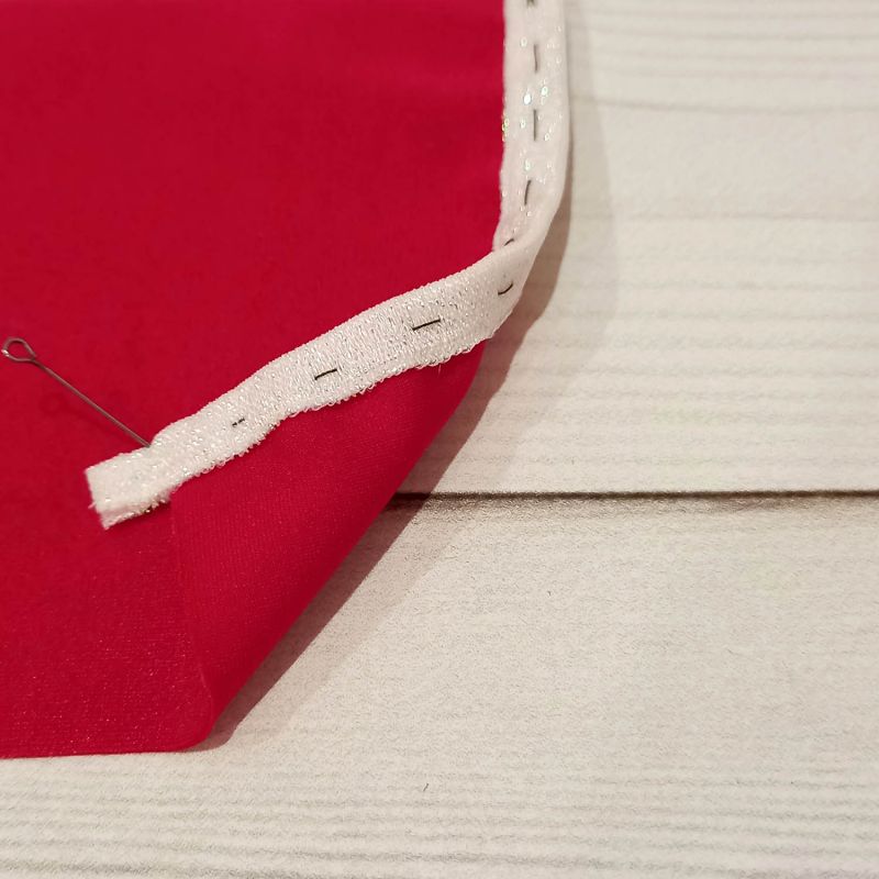 Наложите ленту на лицевую сторону изделия, уравнивая со срезом, приколите, совмещая метки.