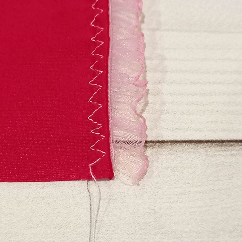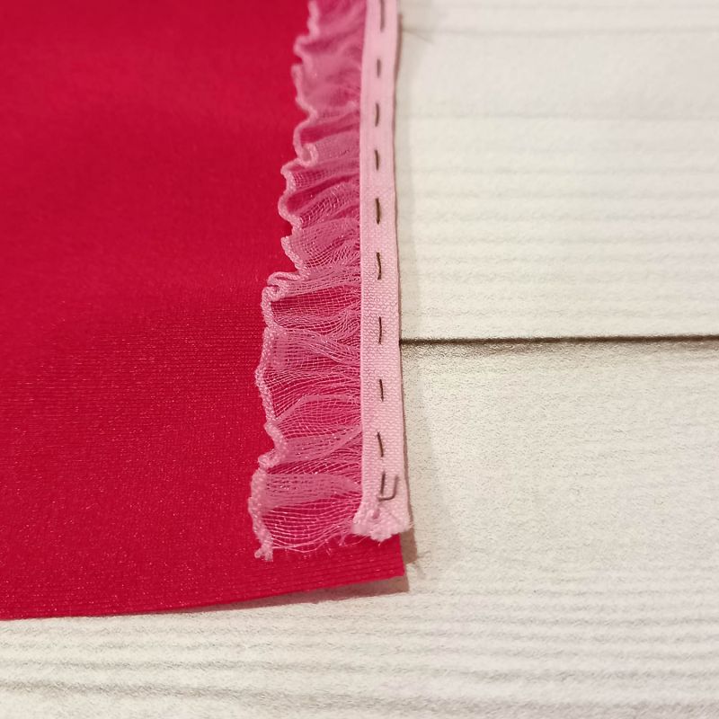 Вспомогательной прямой строчкой (с увеличенной длиной стежка и ослабленным натяжением верхней нити) настрочите резинку на изделие, отступив примерно 0,1-0,2 см от рюши в сторону резинки.