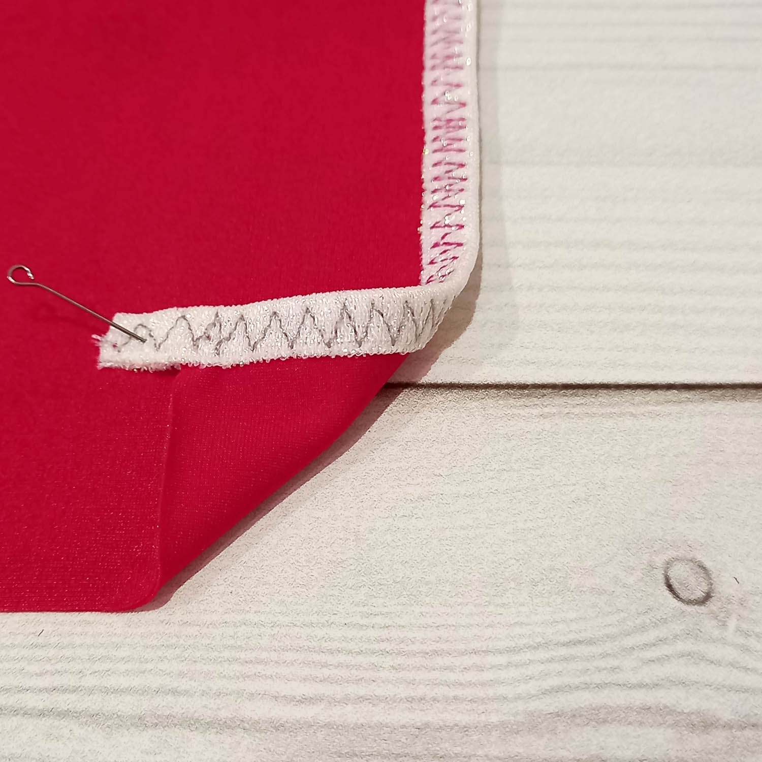 Отверните резинку в сторону изнанки изделия, для удобства выметайте. Проложите фиксирующую трёхступенчатую зигзагообразную строчку по краю шва с лицевой стороны изделия. Обратите внимание: строчку нужно прокладывать, растягивая только резинку, но не полотно. В противном случае край изделия будет фалдить.