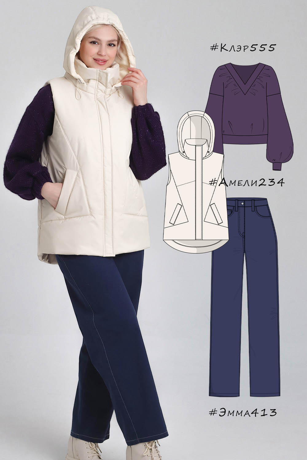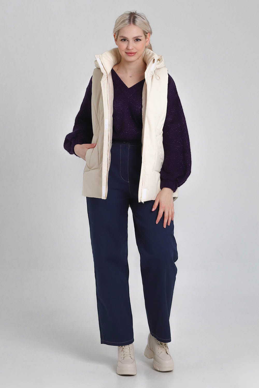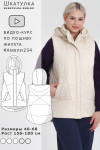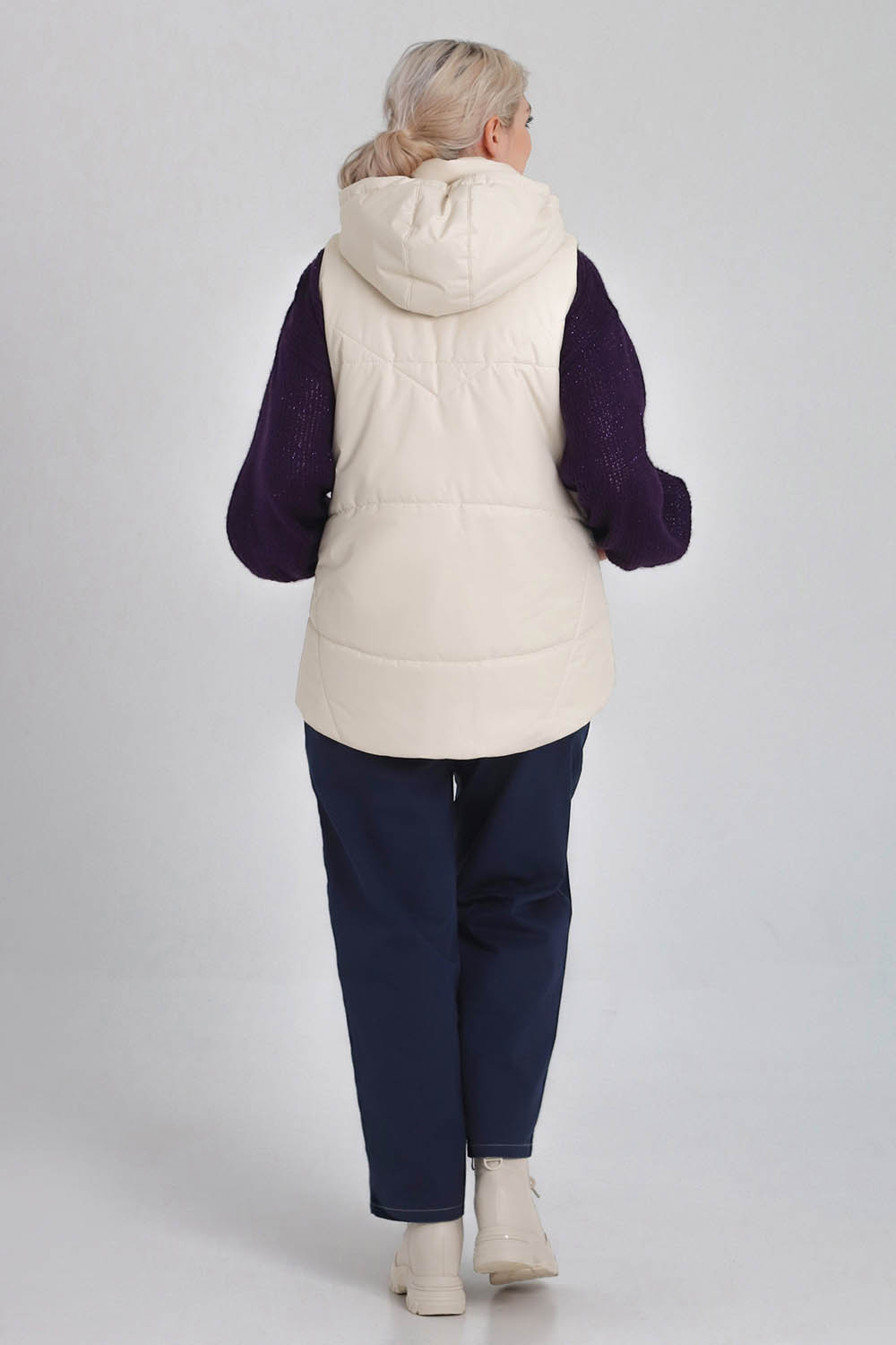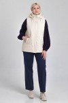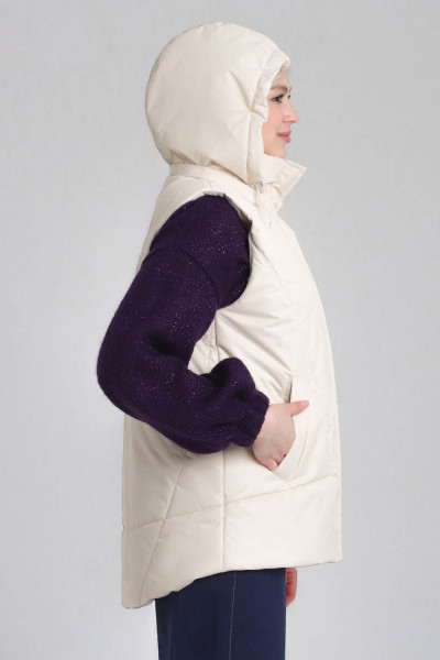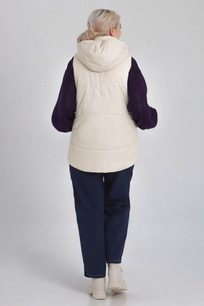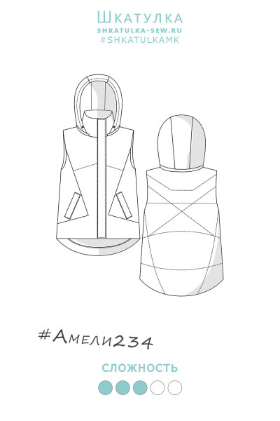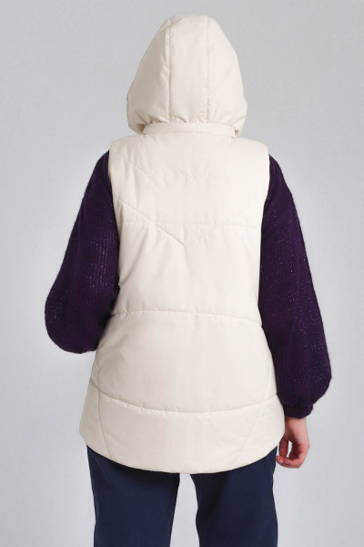 Утепленный женский жилет среднего объёма, немного расширенный к низу. Перед — с фигурными рельефами, с боковыми прорезными карманами с листочками. Спинка — цельная. На спинке и центральных деталях переда предусмотрена стёжка. Застёжка — центральная, на разъёмную молнию и ветрозащитную планку. Горловина жилета оформлена воротником-стойкой и пристёгивающимся двухшовным капюшоном с кулиской. Внутрь кулиски вставлена шляпная резинка с регуляторами, позволяющими менять степень прилегания капюшона к голове. Длина жилета — до середины бедра. Спинка немного удлинена по низу, форма низа спинки — скруглённая.