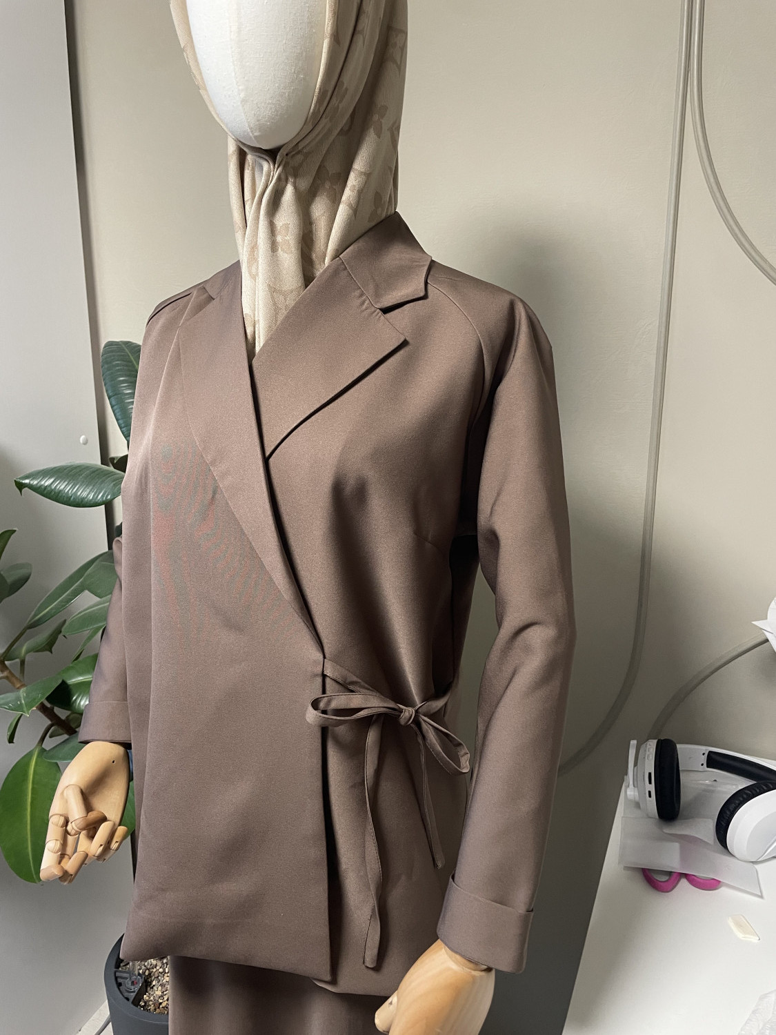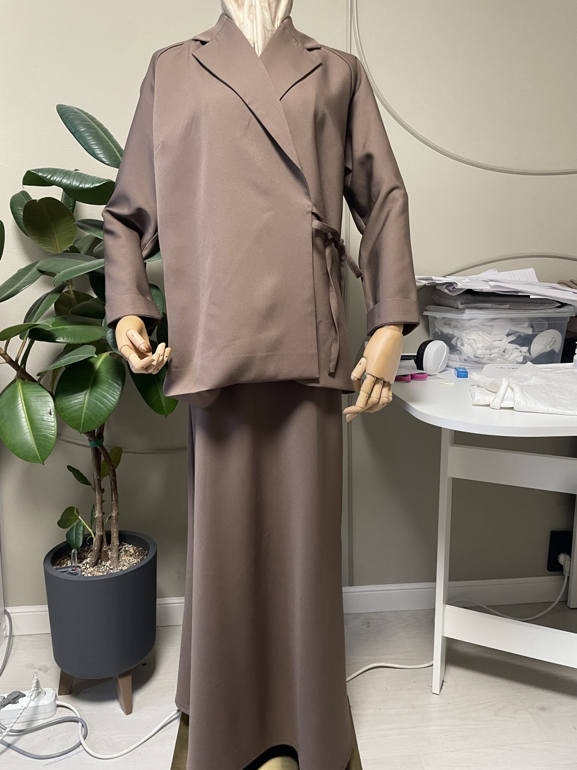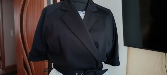 Застёжка на потайные кнопки и втачной пояс с пряжкой. Детали переда наложены друг на друга и зафиксированы в таком положении при помощи кругового притачного пояса на резинке со вставкой, расположенного по низу изделия. Длина изделия — до талии.