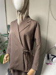 4Выкройка укороченной женской блузки-жакета среднего объёма, прямого силуэта. Перед — с нагрудными вытачками, выходящими из боковых швов. Спинка — цельная, без особенностей. Рукава — покроя реглан, одношовные, с плечевой вытачкой, длиной до локтя, с отложными манжетами по низу. Горловина блузки оформлена английским воротником с отложными лацканами.