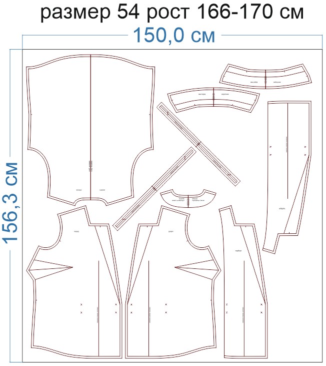 Образцы раскладки на ткани для выборочных размеров (расчет выполнен для однотонной ткани без учета направления ворса):