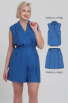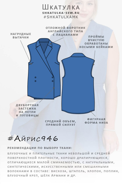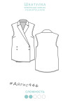 4Выкройка женской блузки среднего объёма, прямого силуэта. Перед - с нагрудными вытачками, выходящими из боковых швов. Спинка - цельная, без формообразующих конструктивных особенностей. Застёжка - центральная, двубортная, на обмётанные петли и пуговицы. Горловина оформлена отложным воротником английского типа с лацканами. Проймы обработаны вчистую косыми бейками. Форма низа изделия - фигурная.
