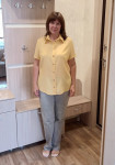 Женская блузка-рубашка полуприлегающего силуэта, небольшого объёма, с рубашечным воротником на притачной стойке, с застёжкой на притачные планки с обмётанными петлями и пуговицами, с фигурной линией низа, длиной до линии бёдер.