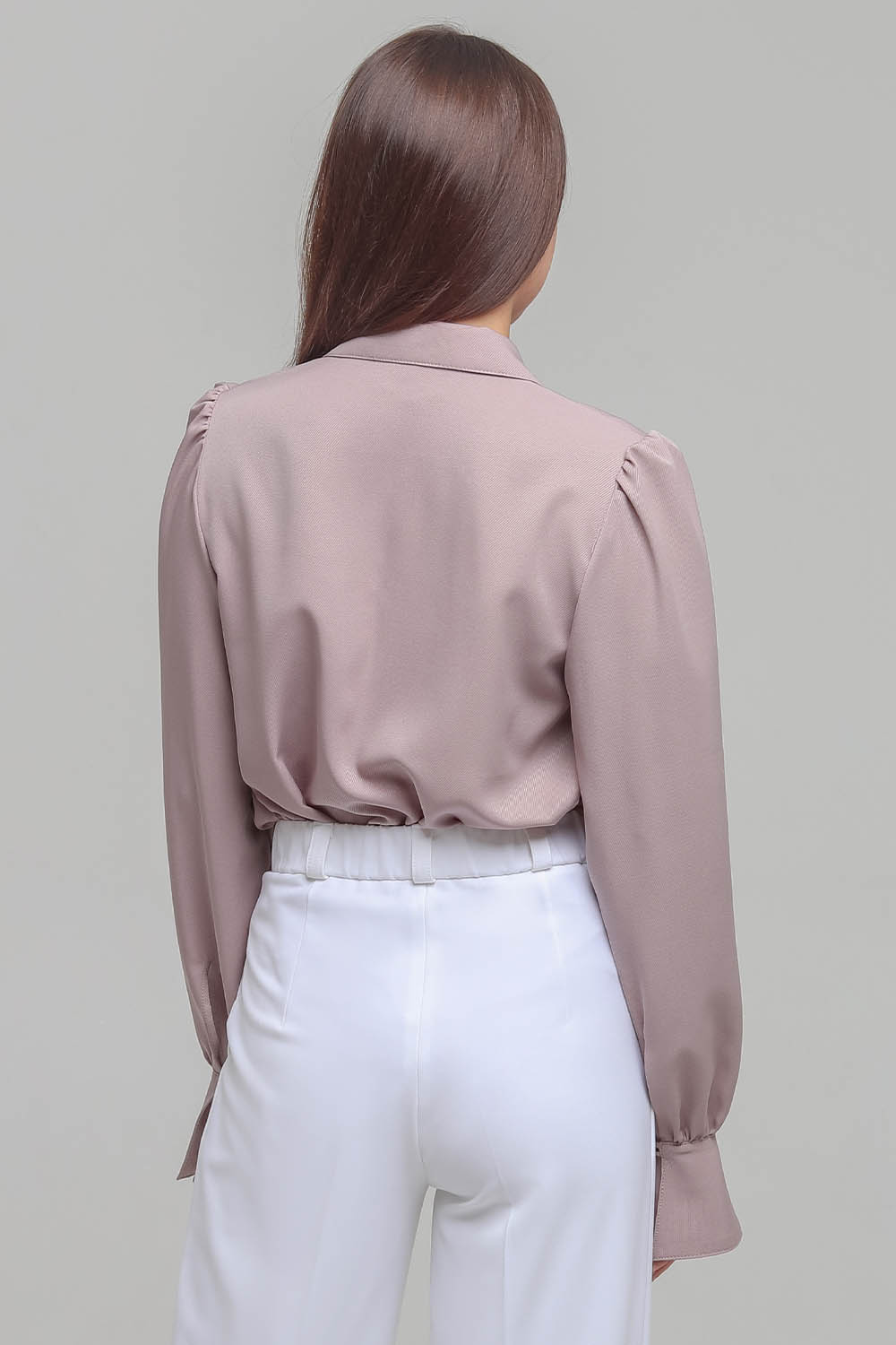 4Выкройка женской блузки среднего объёма, прямого силуэта. Перед - с фигурной кокеткой и сборкой по шву притачивания кокетки. Спинка - цельная, без формообразующих конструктивных элементов. Горловина обработана отложным воротником. Застёжка - центральная, на фигурные планки, обмётанные петли и пуговицы. Рукава - втачные, объёмные, со сборкой по окату, со сборкой и разрезом по низу, на притачной, расширяющейся книзу манжете, застёгивающейся на воздушную петлю и пуговицу. Длина блузки - до линии бёдер.