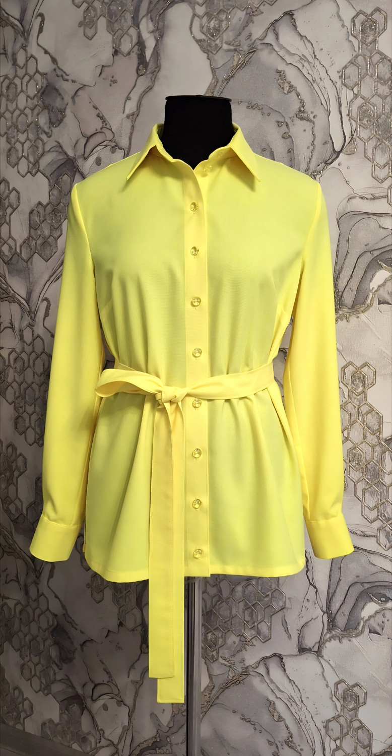 Женская рубашка умеренного объёма, полуприлегающего силуэта. С нагрудными вытачками и нагрудными карманами на полочках, с плечевыми вытачками на спинке. С настрочной кулиской по талии, рубашечным воротником на стойке, застёжкой на планки, петли и пуговицы, с длинными рукавами с манжетами и планками по низу, с фигурной линией низа. Длина изделия - до середины бёдер.