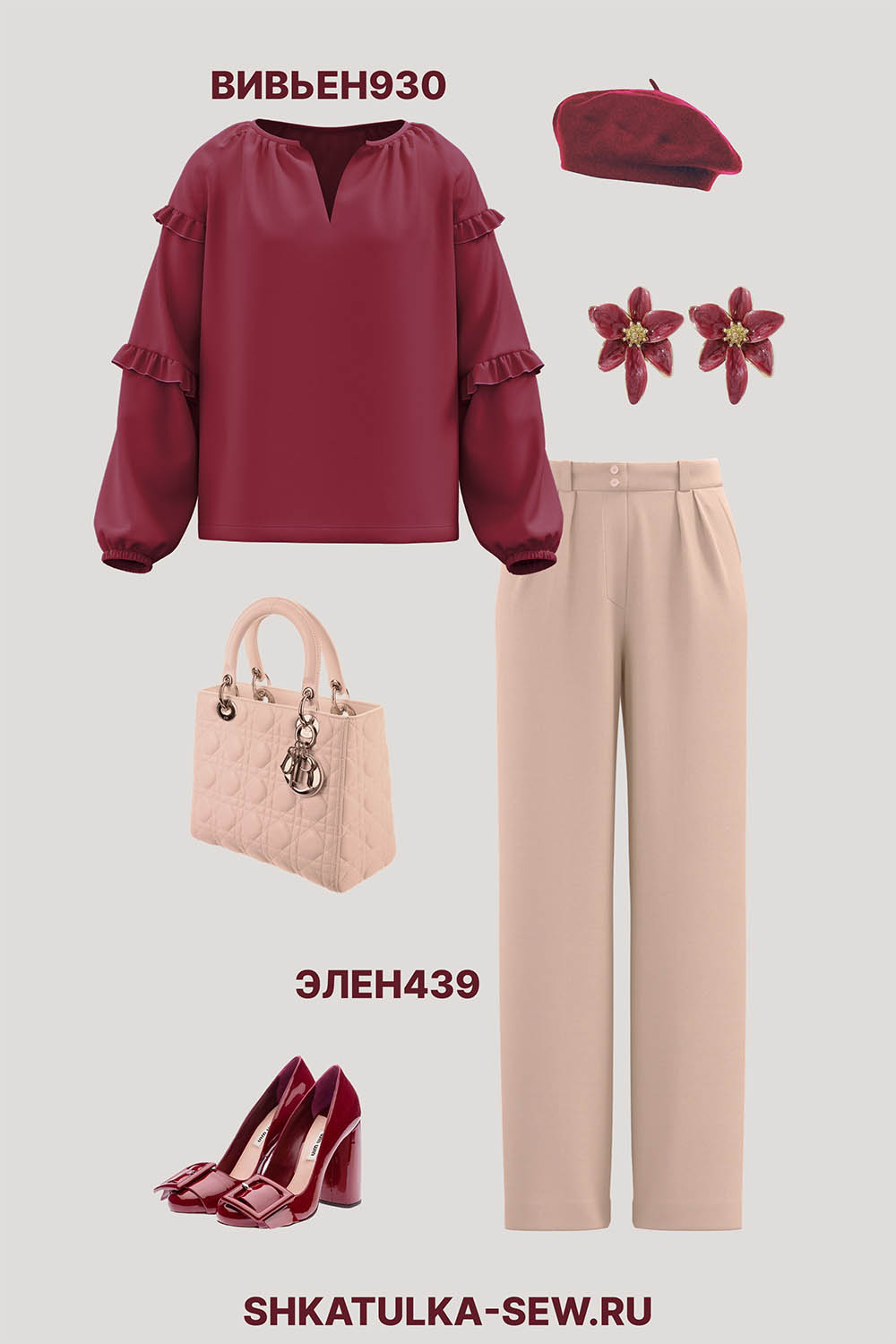 4Выкройка женской блузки среднего объёма, прямого силуэта. Перед цельный, со сборкой по горловине. Спинка - цельная, без конструктивных формообразующих особенностей. Горловина блузки - комбинированной формы, круглая с V-образным вырезом по центру переда. Вырез переда обработан подкройной обтачкой, а сам срез горловины обработан косой бейкой. Рукава - покроя реглан, состоящие из верхней, средней и нижней частей, длинные, на резинке по низу. Верхний срез рукавов присборен. В швах стачивания частей рукавов предусмотрены оборки, декорированные кружевом.