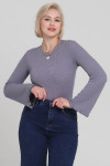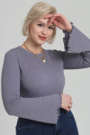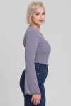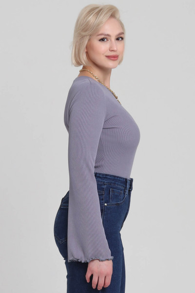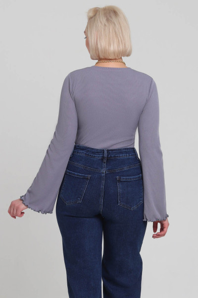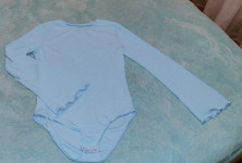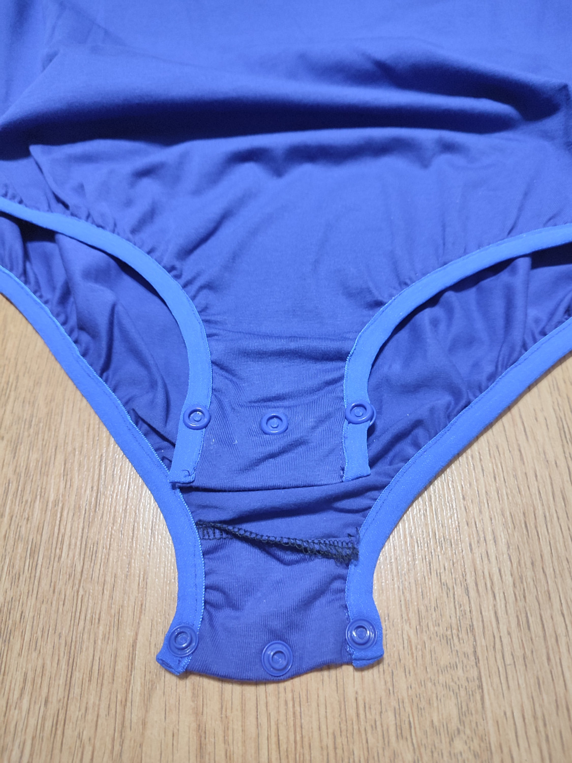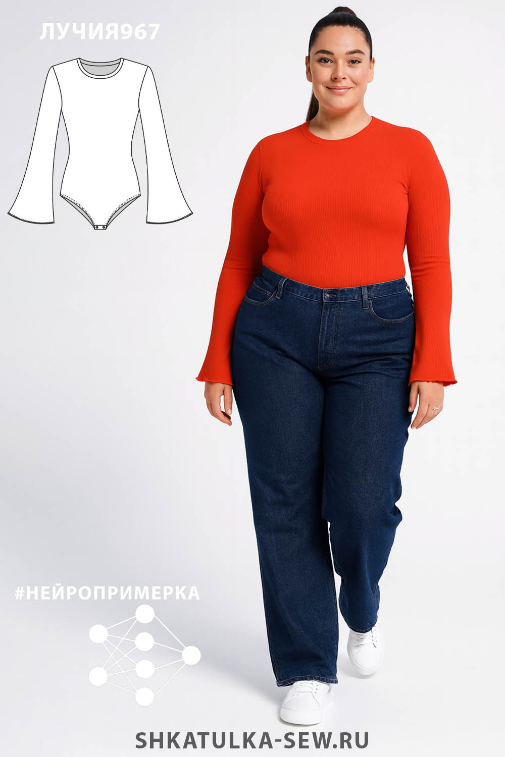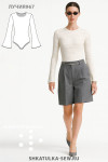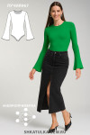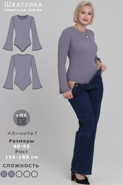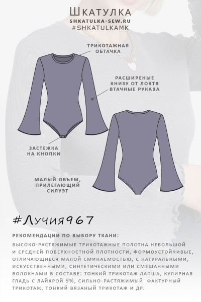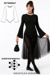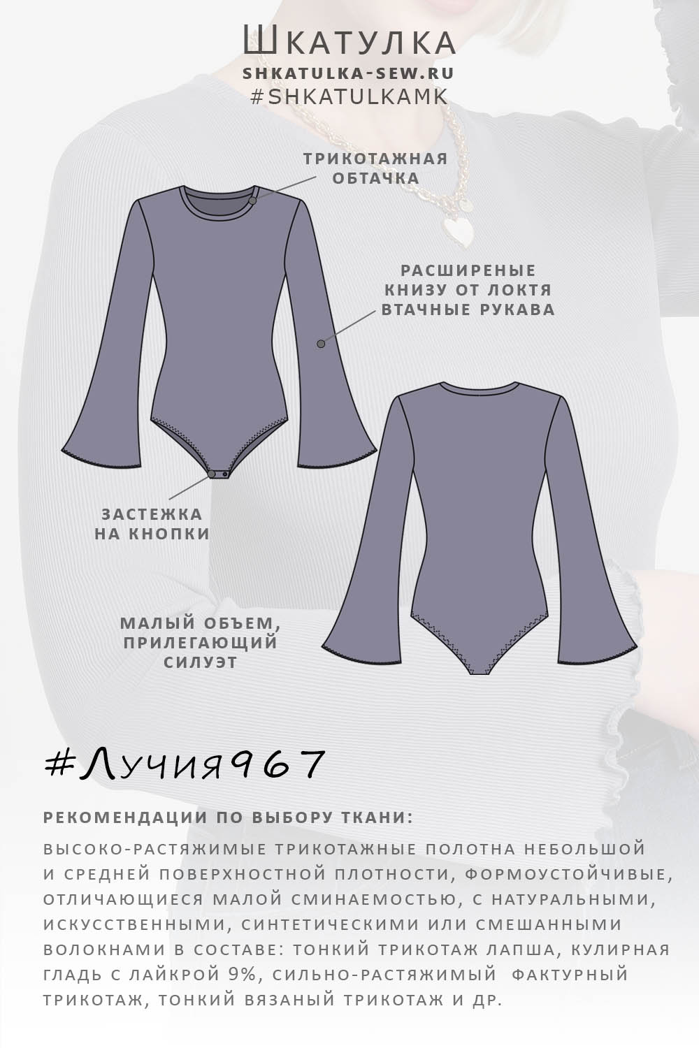 4Выкройка женского боди малого объёма, прилегающего силуэта. Перед и спинка - цельные, без формообразующих конструктивных элементов. Горловина боди - круглой формы, обработана трикотажной обтачкой. Застёжка на кнопки расположена по низу переда и спинки. Рукава - втачные, длинные, расширенные книзу от локтя, по низу обработаны ролевым швом.