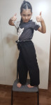 4Выкройка широких брюк с завышенной талией для девочки. Умеренный объем, карманы с отрезным бочком, в пояс вставлена резинка, собирающая верхнюю часть брюк в рюшу. Спереди завязки служат только для декоративного банта.