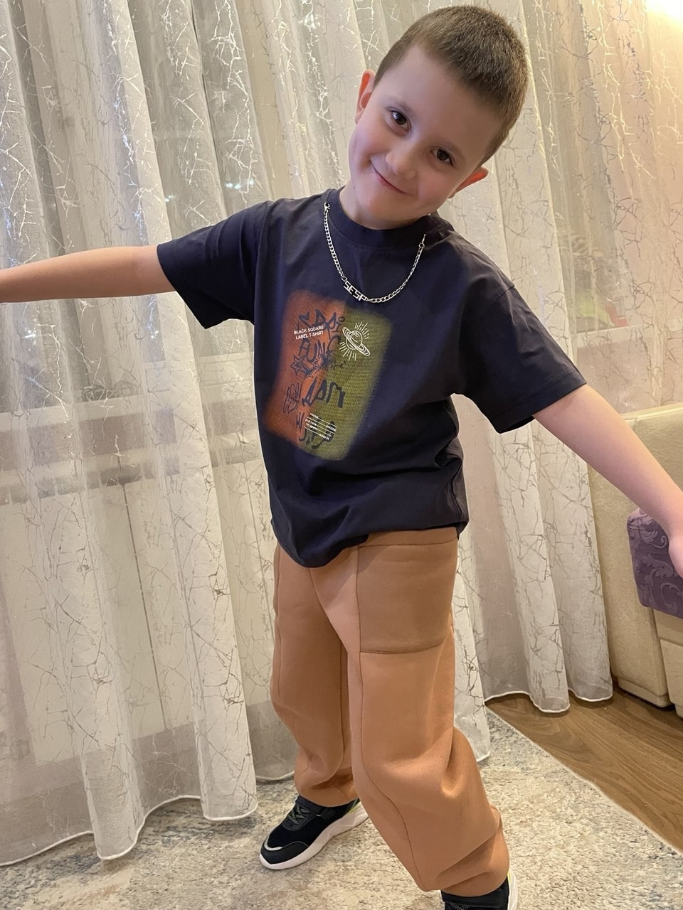 10Параметры модели: рост 120 см, обхват груди 60 см, обхват талии 55 см, обхват бедер 61 см. Выбрана выкройка 116 размера. Выкройка удлинена по росту ребенка.