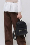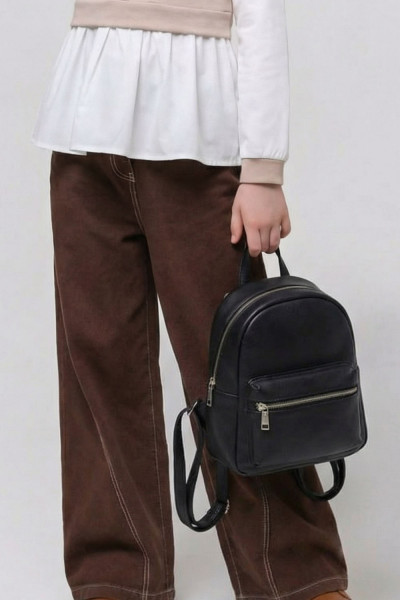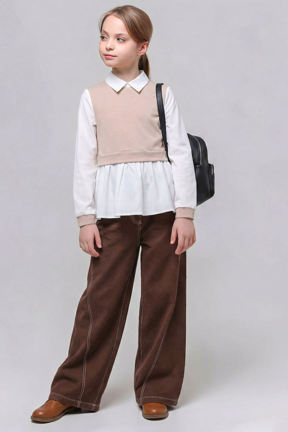 Линия талии в брюках находится на естественном месте. Верхний срез брюк обработан притачным поясом на резинке. Функциональной застёжки в брюках нет, но есть фальшивый гульфик по центру переда.