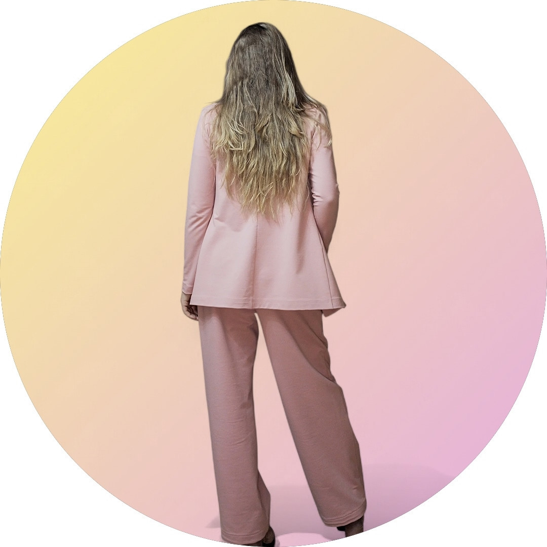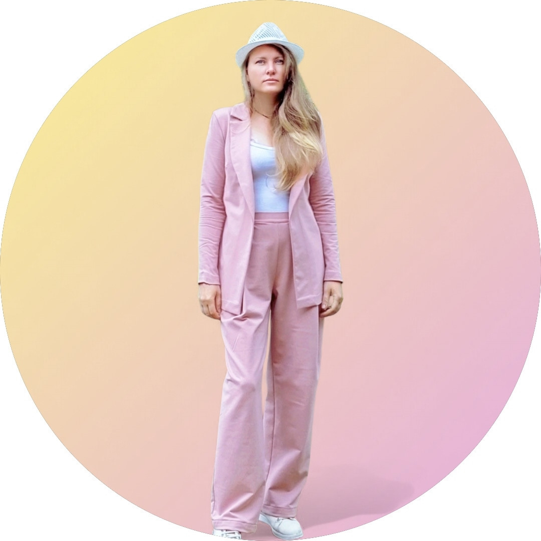 4Выкройка прямых женских трикотажных брюк умеренного объёма, полуприлегающего силуэта. Передние половинки - с боковыми карманами с подрезным бочком и глубокими складками по линии талии. Задние половинки - цельные, без формообразующих конструктивных элементов. Линия талии в брюках находится на естественном месте. Верхний срез брюк обработан притачным поясом, в области спинки выполненным на резинке. Длина брюк - до щиколотки.