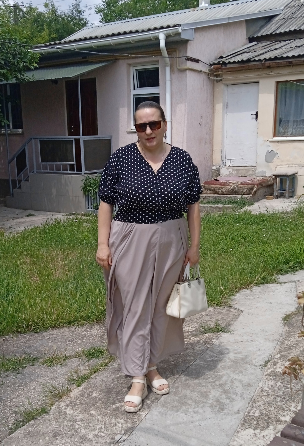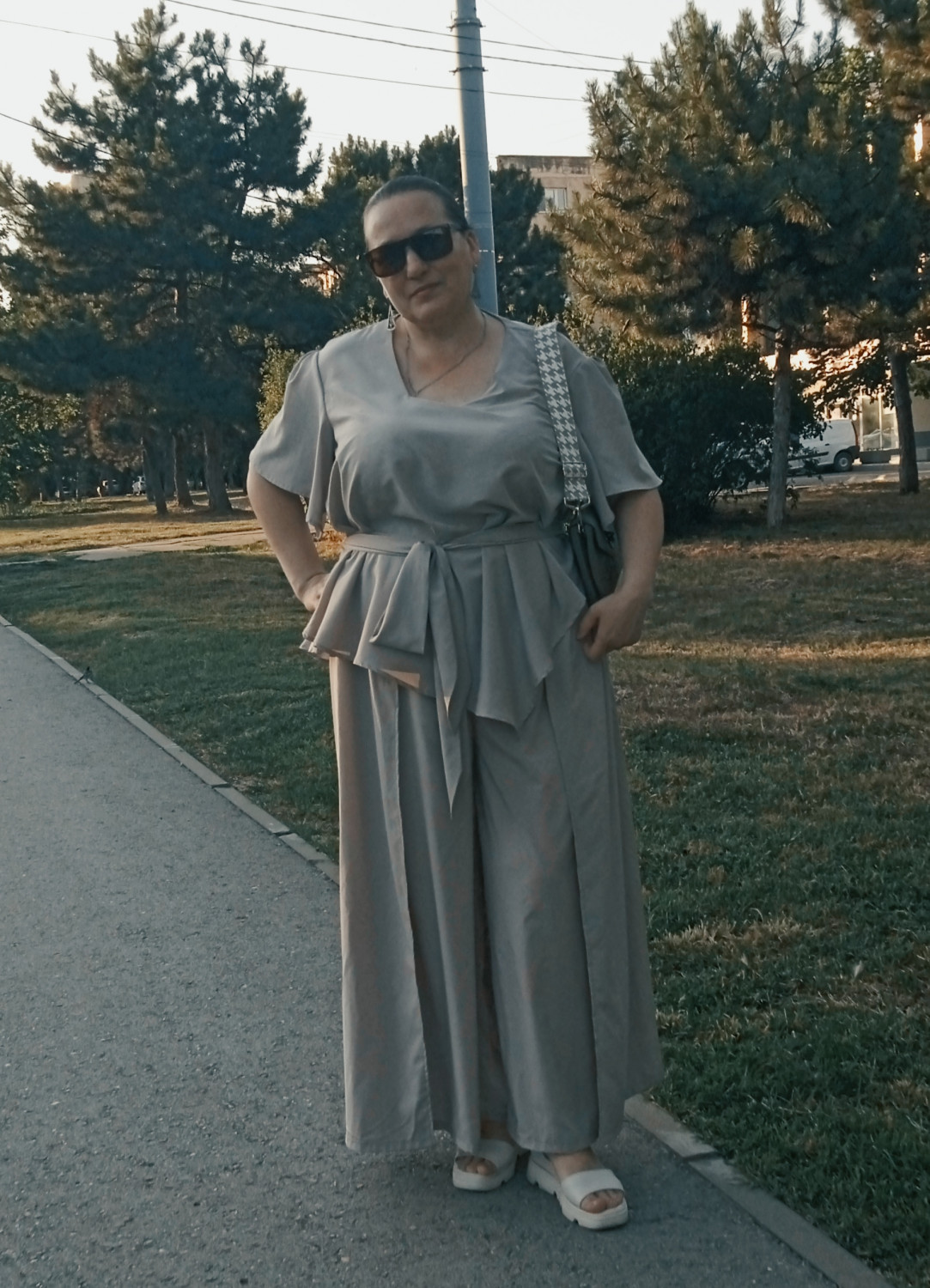 10Параметры модели: рост 173 см, обхват груди 92 см, обхват талии 72 см, обхват бедер 104 см. Выбрана выкройка 48 размера, рост 171-175 см. Корректировки не выполнялись.