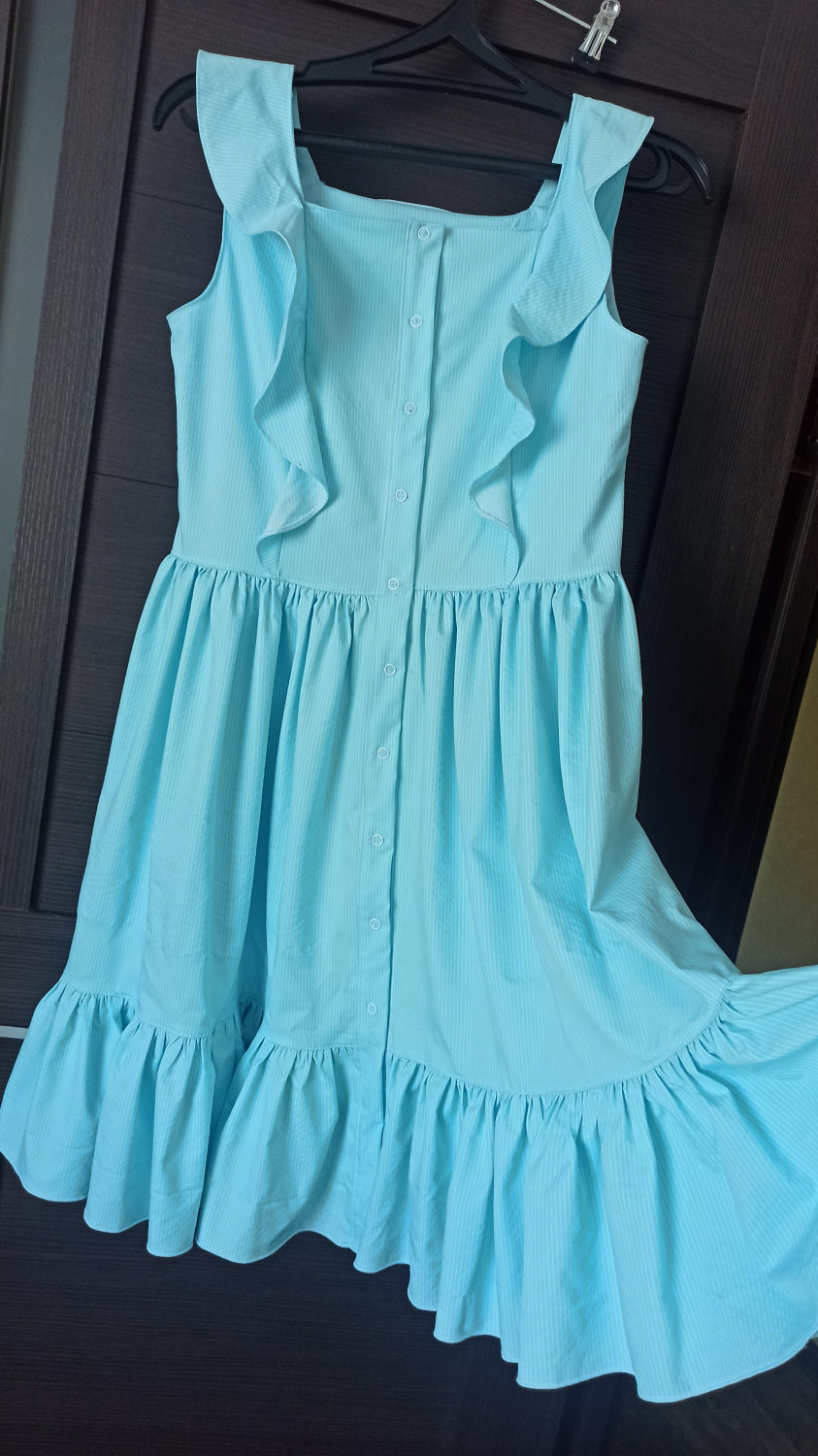 20. Приметайте, притачайте верхнюю оборку к платью. Припуск шва обметайте, заутюжьте вверх.