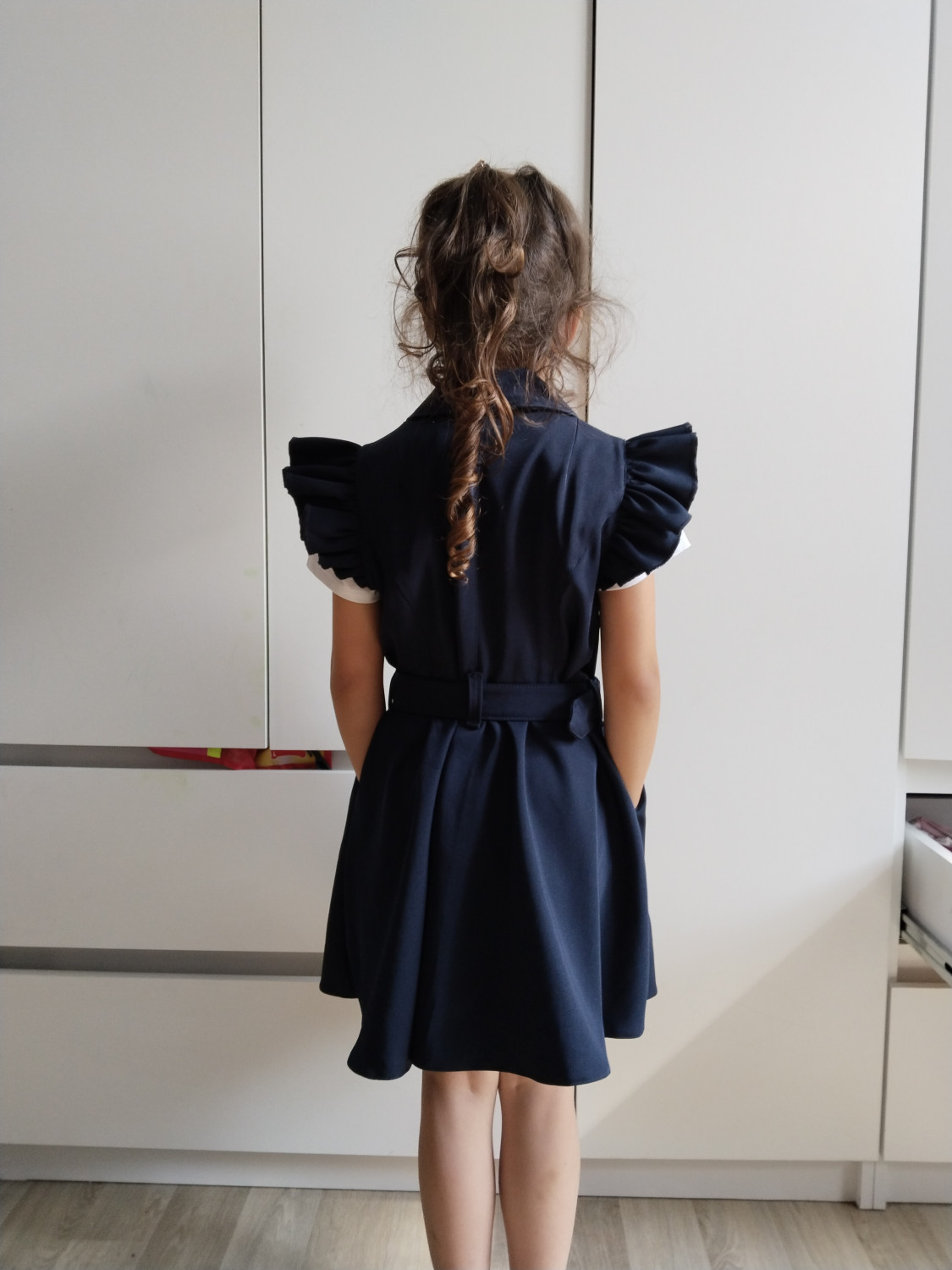 Такое элегантное детское платье-сарафан станет для любой ученицы самым оптимальным вариантом школьной формы. В отличие от обычного платья оно дает уникальную возможность поэкспериментировать с образами: лаконичная водолазка или нарядная блузка; строгая рубашка или уютный теплый свитер. Такой сарафан гораздо комфортнее и практичнее, чем юбка или даже брюки. К тому же он очень романтичен: воротник-шалька, крылышки, рельефы и пышная юбка с поясом добавляют в деловой стиль особый шарм и эстетику. Передняя застежка на пуговицы очень удобная - с ней справится даже первоклассница.
