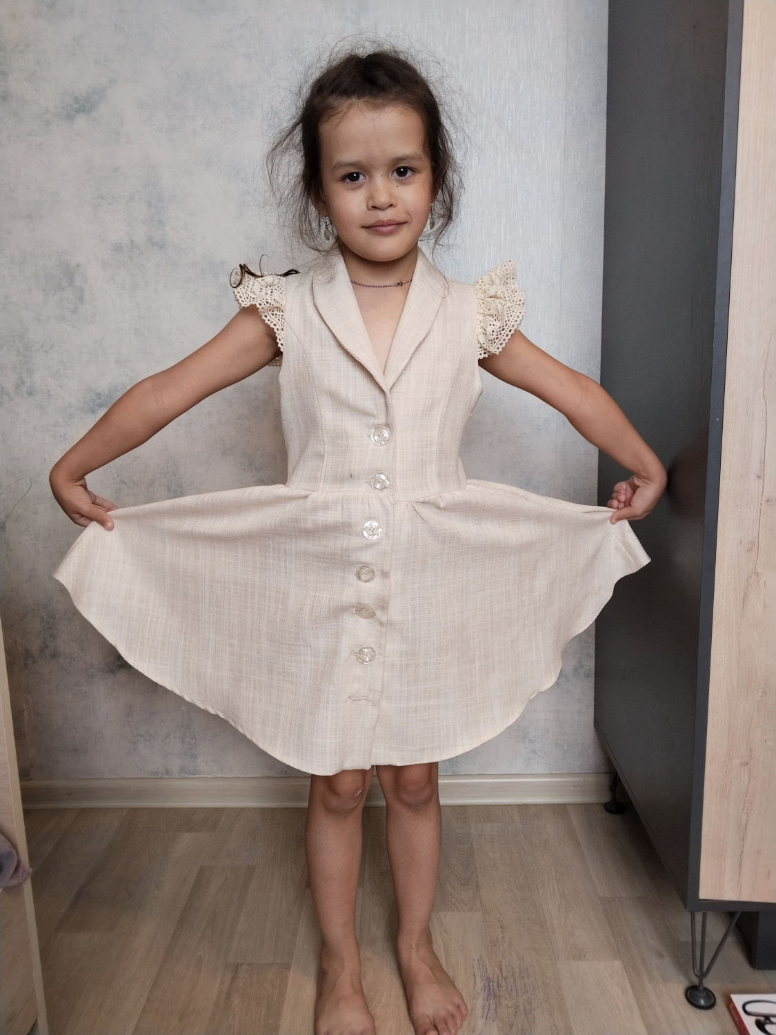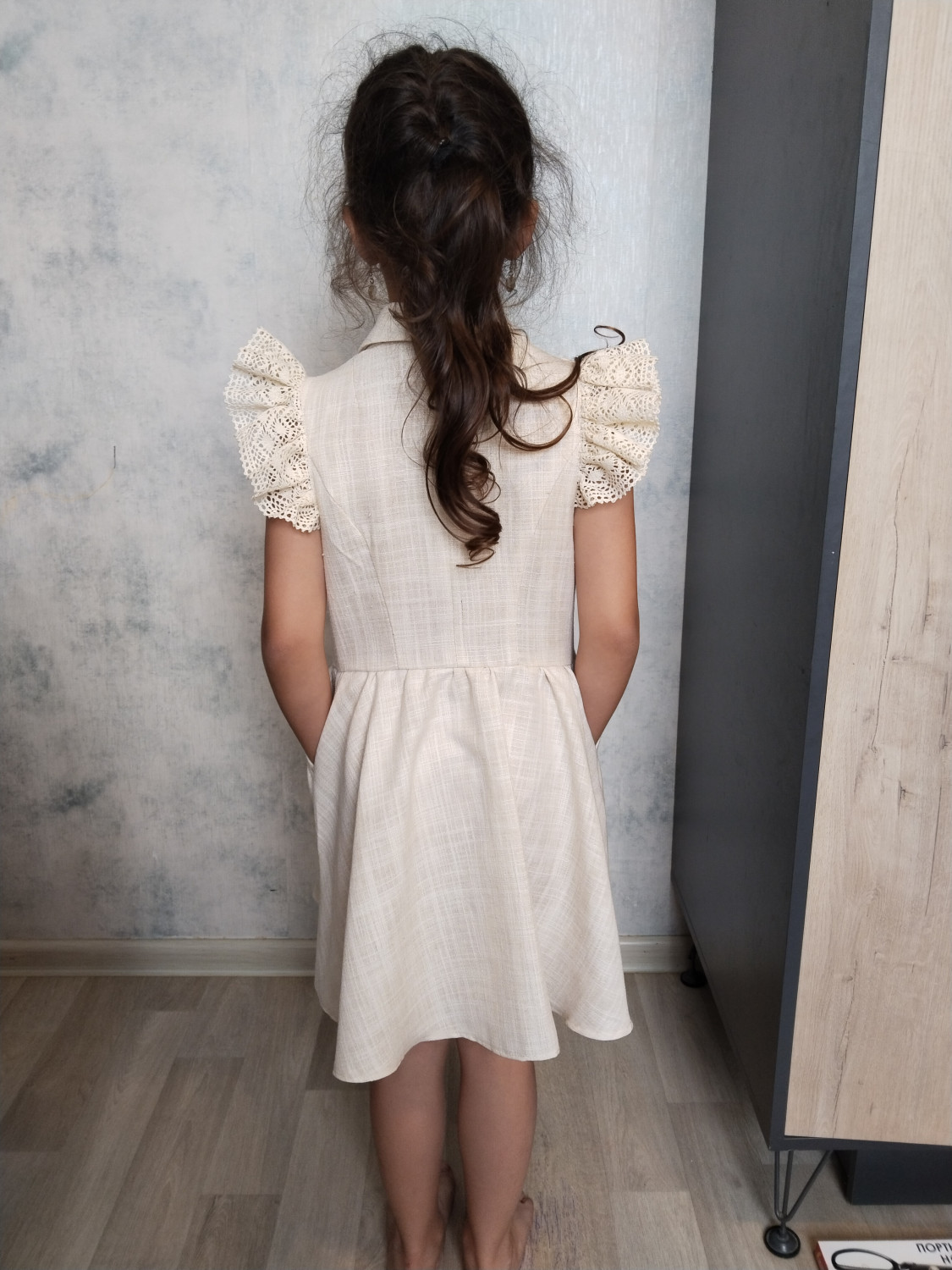 10Параметры модели: рост 127 см, обхват груди 63 см, обхват талии 56 см, обхват бедер 70 см. Выбран размер 128. Корректировки не выполнялись.