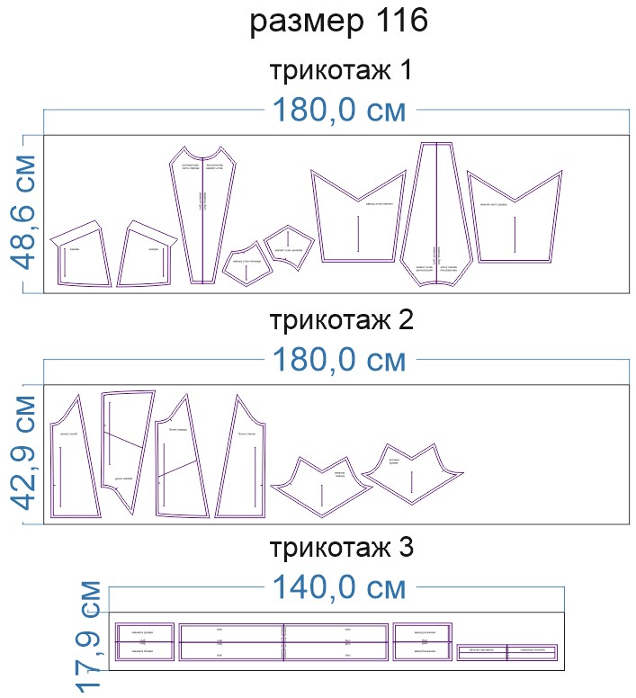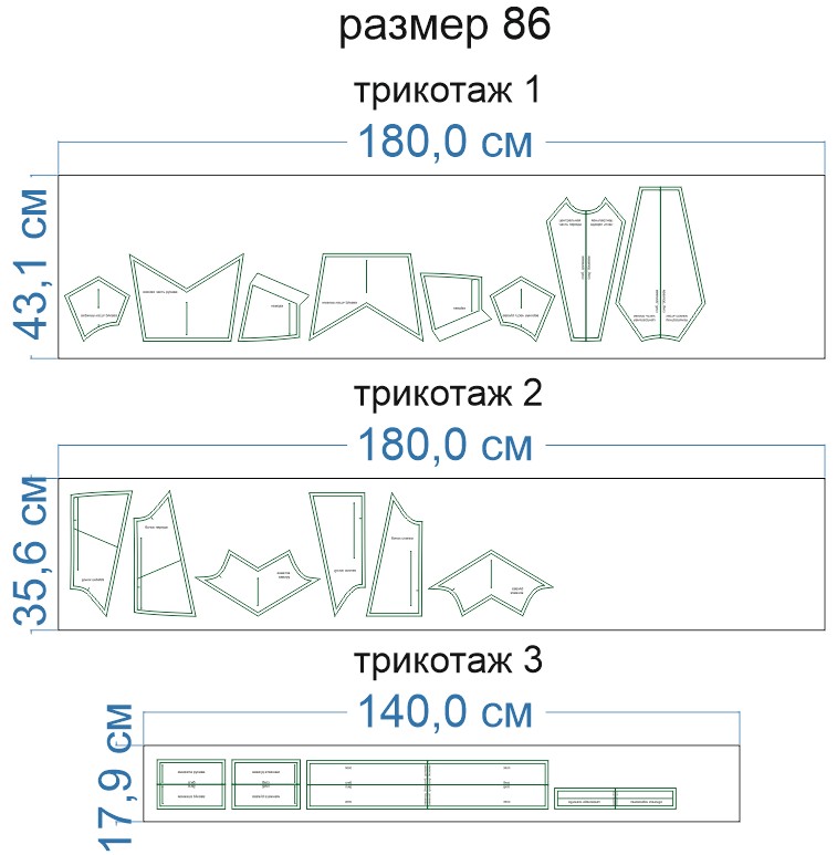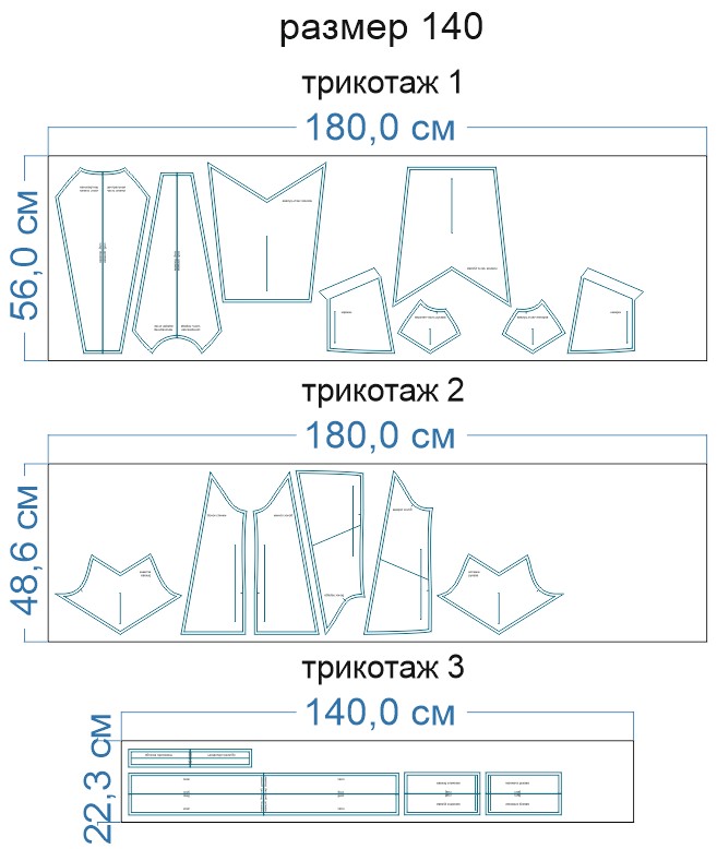Образцы раскладки на трикотаже для выборочных размеров (расчет выполнен для однотонного трикотажа одного цвета без учета направления ворса):