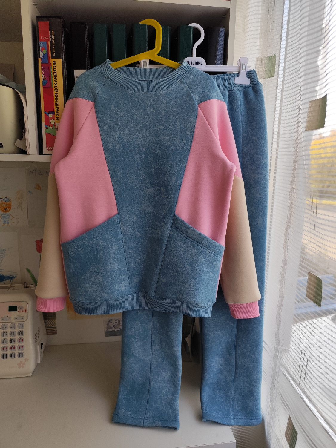 Образец сшит из трикотажа футер 3-нитка начес, манжеты и пояс выполнены из кашкорсе.
