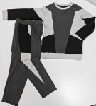 Боковые части переда, вставки рукавов и боковые части спинки выполнены из трикотажа одного вида, остальные детали - из трикотажа второго вида. Манжеты, пояс и обтачка горловины выполнены из кашкорсе.