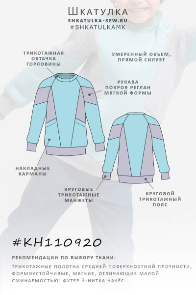 Выкройка детской трикотажной толстовки умеренного объёма, прямого силуэта, выполненной из трикотажа двух видов. Перед состоит центральной части и бочков. По низу бочков предусмотрены накладные карманы. Спинка состоит из центральной части и бочков. Горловина толстовки обработана трикотажной обтачкой. Рукава - покроя реглан мягкой формы (без вытачки), состоят из верхней и нижней частей и вставки. Длина рукавов - до запястья. По низу рукавов предусмотрены круговые трикотажные манжеты. Длина толстовки - ниже линии бёдер.