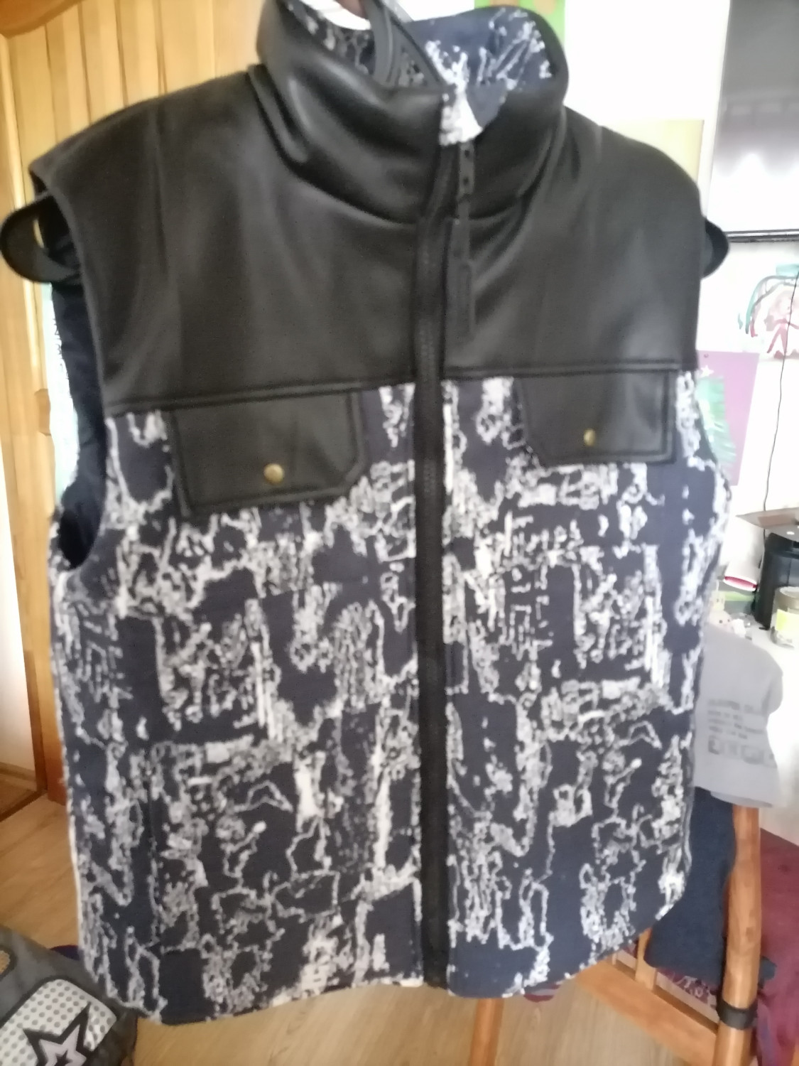 Перед — с нагрудными накладными карманами с клапанами и с боковыми прорезными карманами с листочками. Спинка — цельная, без особенностей. Горловина жилета обработана высоким воротником-стойкой. Застёжка — разъёмная молния доверху, с внутренней ветрозащитной планкой. Линия низа переда и спинки — фигурная.