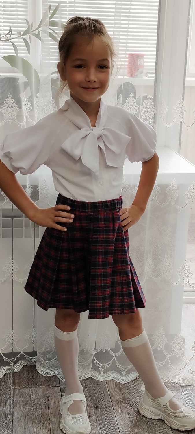 10Параметры модели: рост 127 см, обхват груди 63 см, обхват талии 56 см, обхват бедер 70 см. Выбран размер 128. Корректировки не выполнялись.