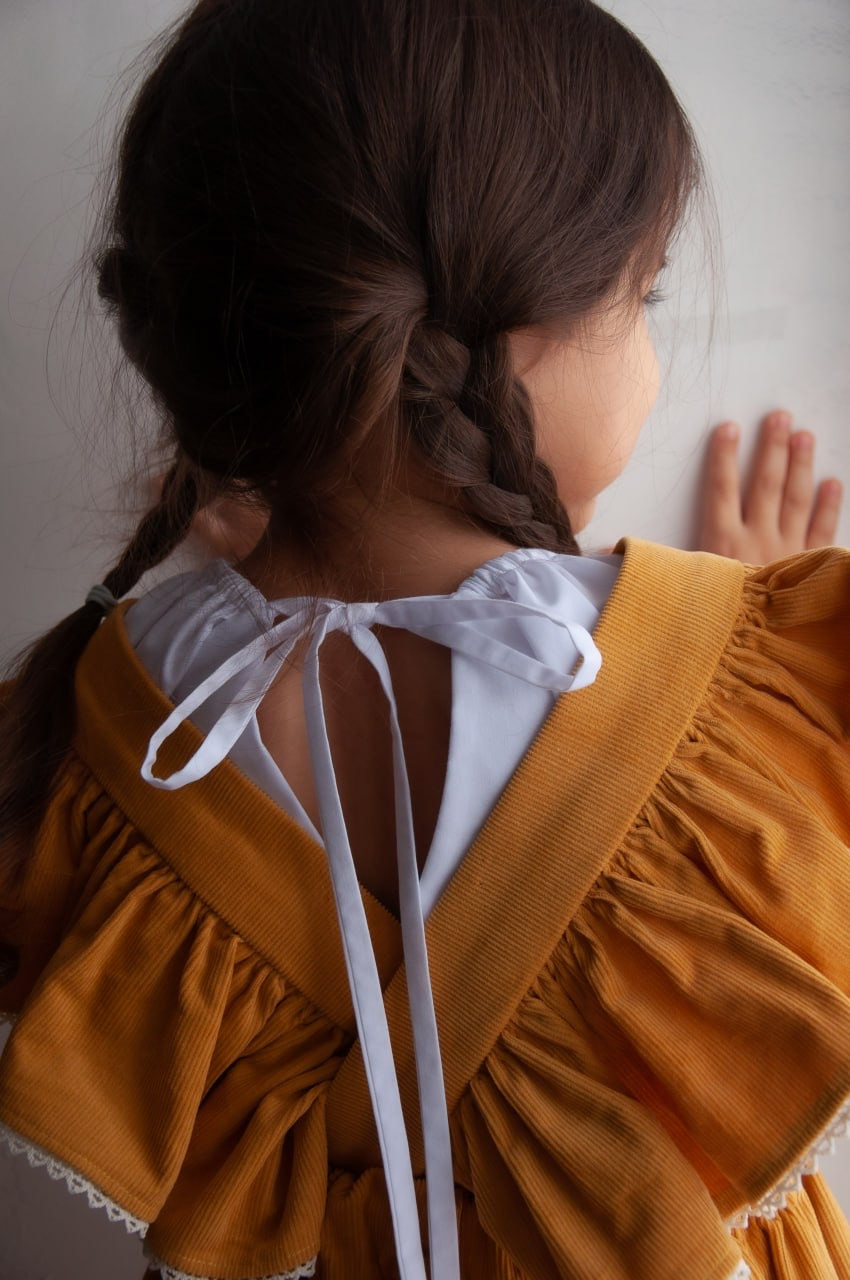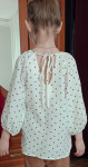 4Выкройка детской блузки среднего объёма, прямого силуэта. Перед и спинка — цельные, без особенностей. Горловина переда имеет округлую форму, спинки — удлинённую V-образную форму. Обработана подкройной обтачкой. По уголкам горловины спинки предусмотрены узкие  длинные завязки. Рукава — покроя реглан, широкие, длиной ниже локтя, со сборкой по верху и по низу.