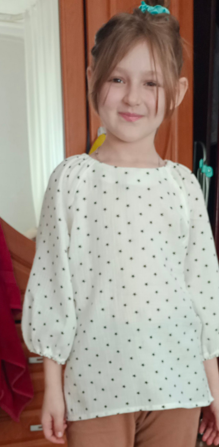 10Параметры модели: рост 118 см, обхват груди 59 см , обхват талии 55 см, обхват бедер 63 см. Выбрана выкройка 116 размера. Корректировки не выполнялись.