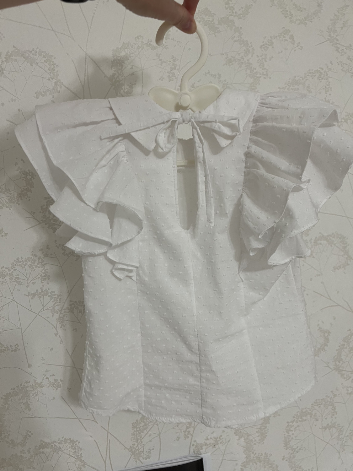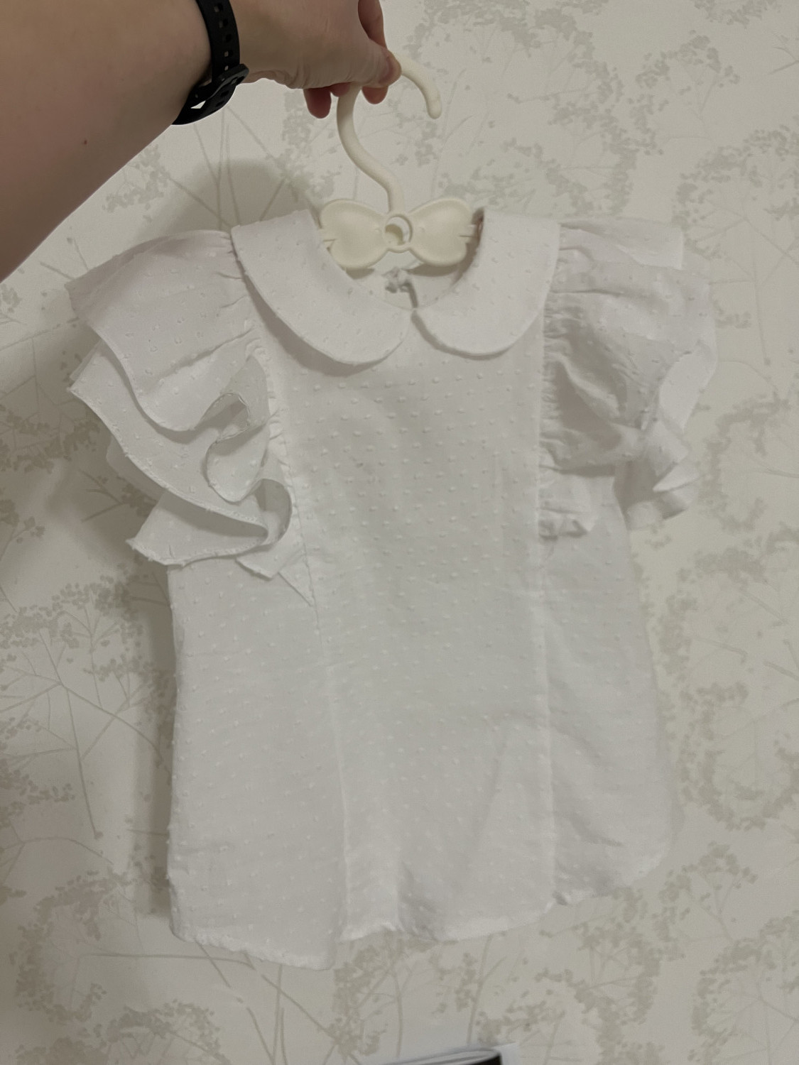 Горловина блузки обработана воротником и подкройными обтачками. Застёжка на спинке, на завязки. Рукава блузки втачные, короткие, со сборкой по окату. Низ переда и спинки фигурный. Длина блузки — до линии бёдер.