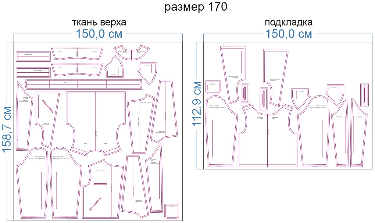 Образцы раскладки на ткани для выборочных размеров (расчет выполнен для однотонной ткани одного цвета без учета направления ворса):