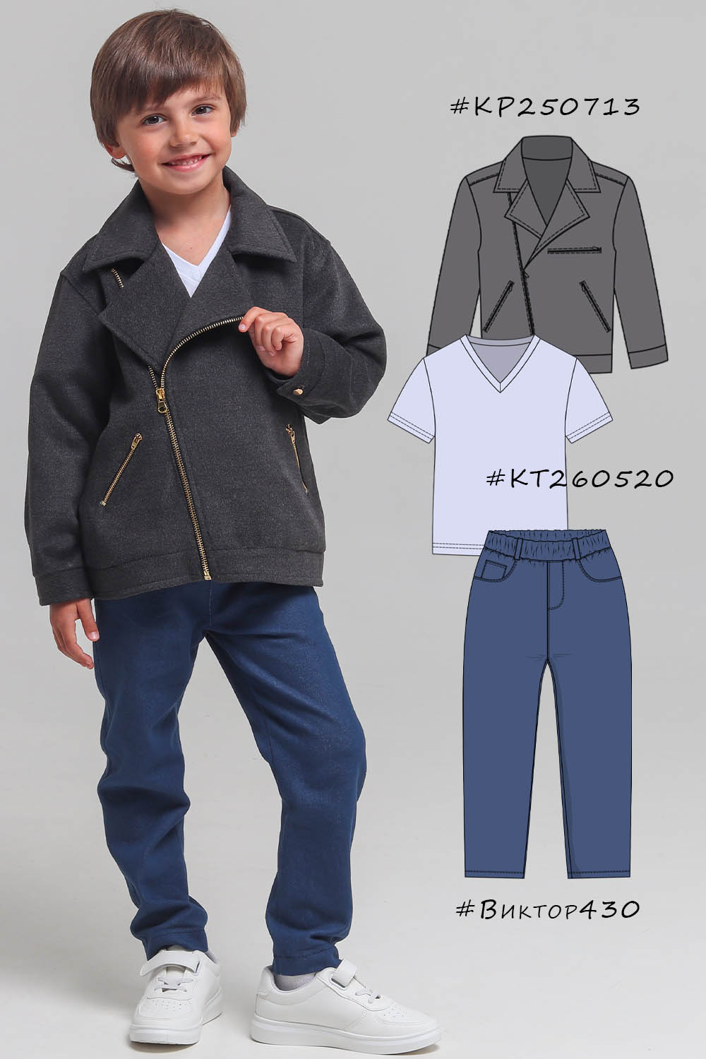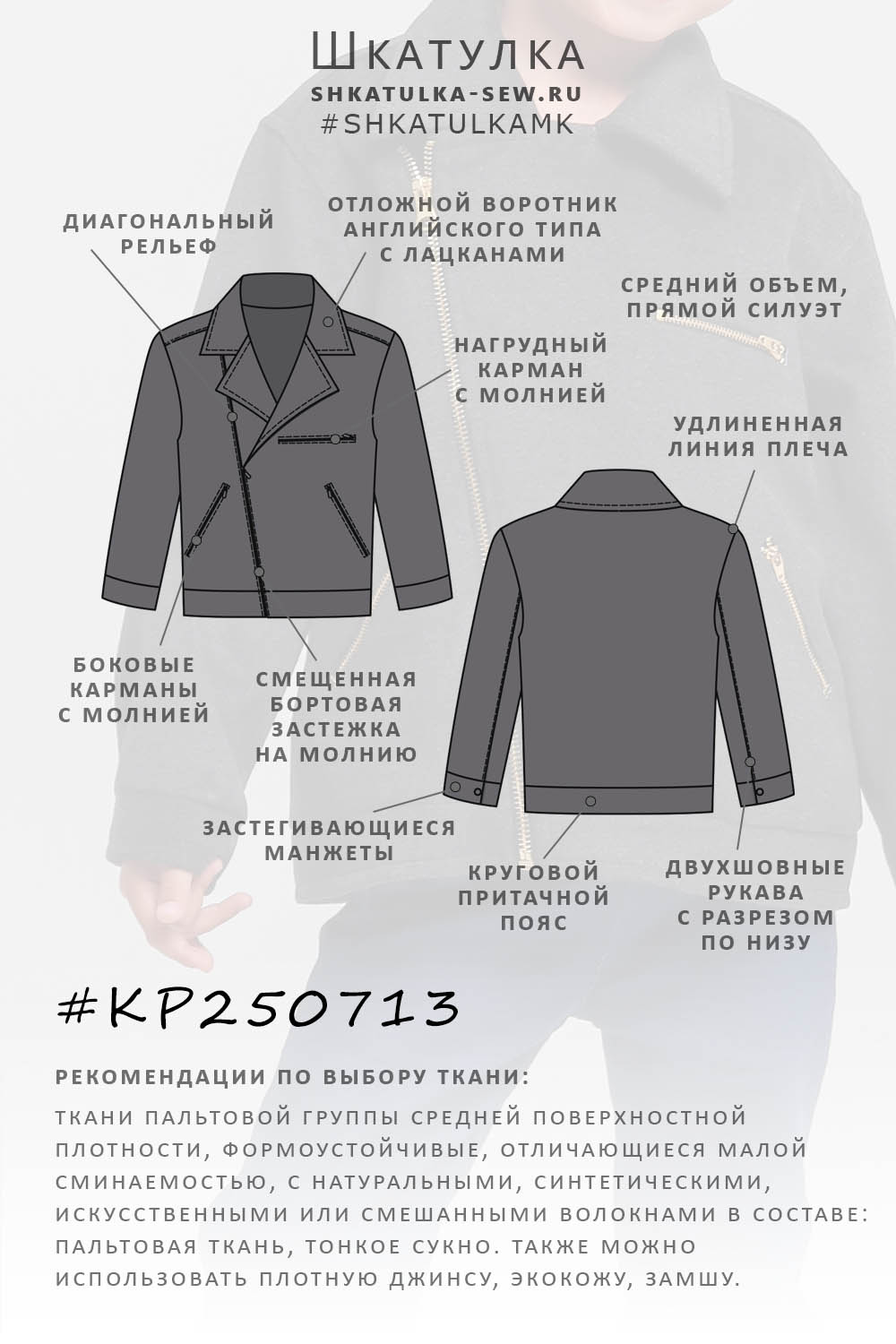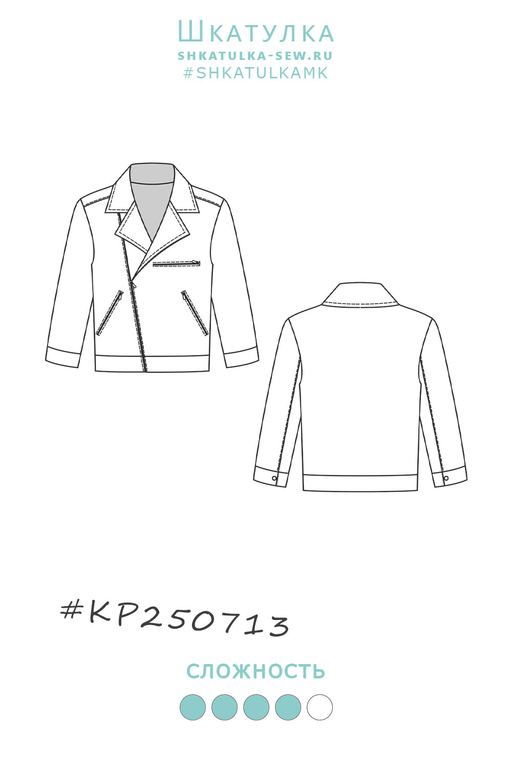 Выкройка детской косухи среднего объёма, прямого силуэта, с немного удлиненной линией плеча. Куртка выполнена на подкладке. Левая часть переда - с нагрудным и боковым карманами с молнией. Правая часть переда - с диагональным рельефом, выходящим из плечевого шва, с боковым карманом с молнией. Спинка - цельная, удлинённая в области плечевых швов и переходящая засчёт этого на перед, имитируя кокетку. Горловина косухи обработана отложным воротником английского типа с лацканами. Застёжка бортовая, смещённая относительно центра, на разъёмную молнию, втачанную с одной стороны в рельеф переда, а с другой - в борт. Рукава - рубашечного покроя, двухшовные, длинные, с разрезом по низу локтевого шва, с притачными застёгивающимися манжетами по низу. По низу куртки предусмотрен круговой притачной пояс.