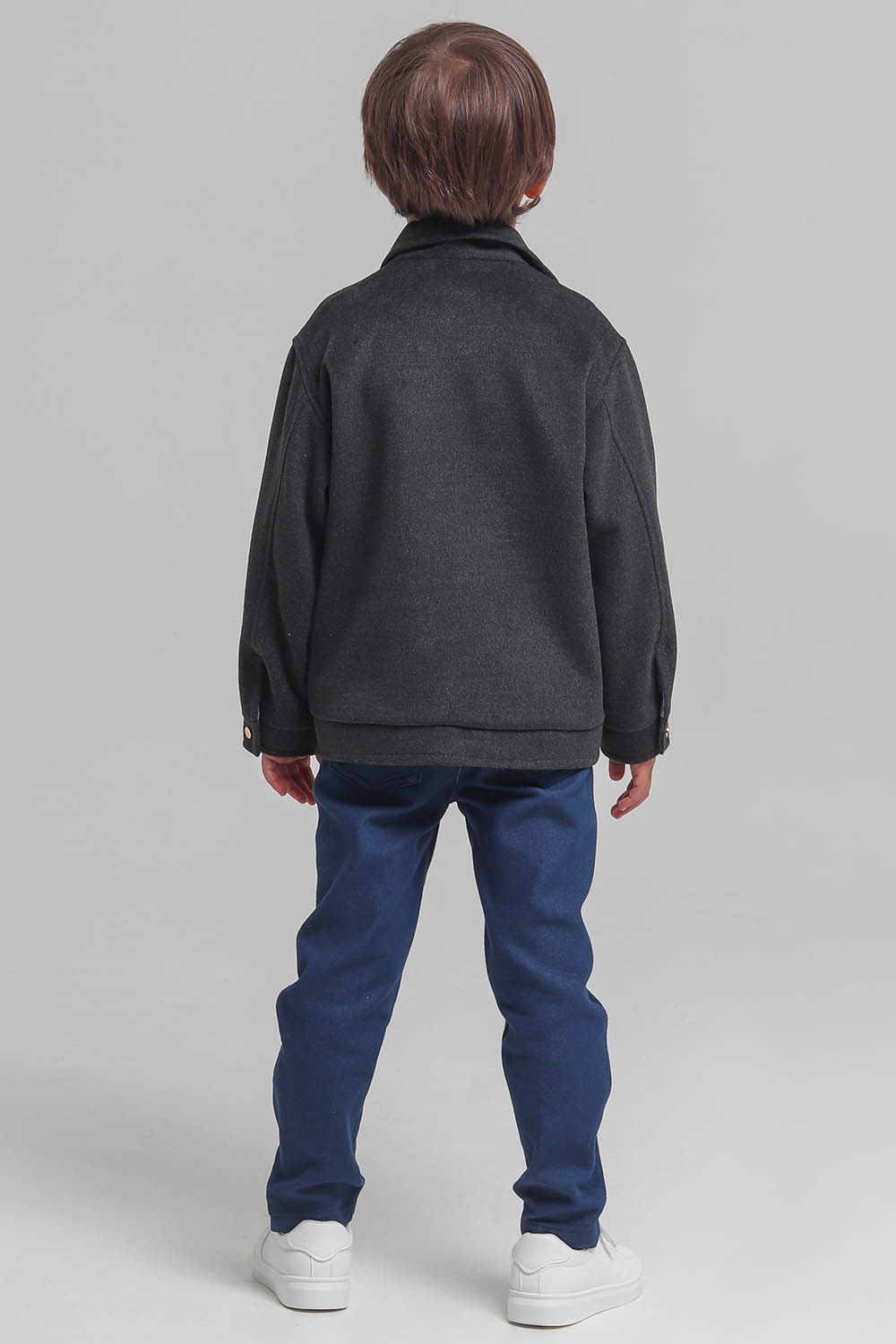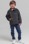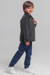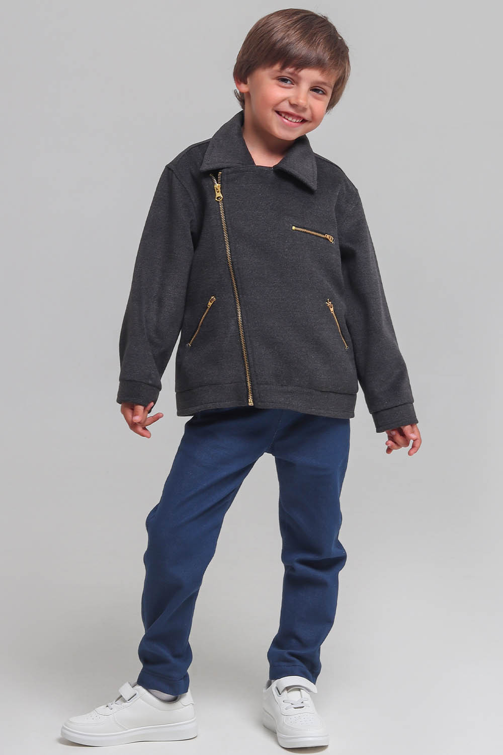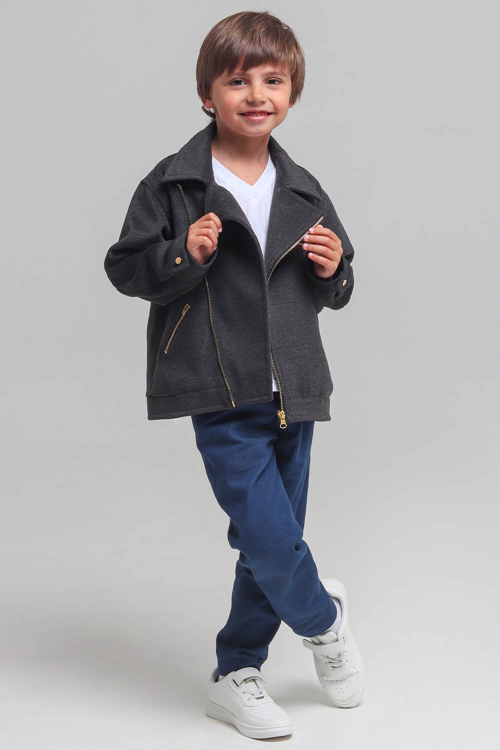 Выкройка детской косухи среднего объёма, прямого силуэта, с немного удлиненной линией плеча. Куртка выполнена на подкладке. Левая часть переда - с нагрудным и боковым карманами с молнией. Правая часть переда - с диагональным рельефом, выходящим из плечевого шва, с боковым карманом с молнией. Спинка - цельная, удлинённая в области плечевых швов и переходящая засчёт этого на перед, имитируя кокетку. Горловина косухи обработана отложным воротником английского типа с лацканами. Застёжка бортовая, смещённая относительно центра, на разъёмную молнию, втачанную с одной стороны в рельеф переда, а с другой - в борт. Рукава - рубашечного покроя, двухшовные, длинные, с разрезом по низу локтевого шва, с притачными застёгивающимися манжетами по низу. По низу куртки предусмотрен круговой притачной пояс.