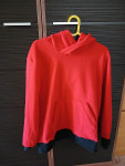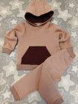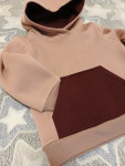 Выкройка детской толстовки большого объёма, прямого силуэта. Перед цельный, с накладным карманом-кенгуру с трикотажными обтачками. Спинка цельная, без особенностей. Горловина обработана втачным двухшовным капюшоном на подкладке. Рукав рубашечного покроя, большого объёма, длинный, с трикотажной манжетой по низу. Низ изделия обработан притачным трикотажным поясом. Длина изделия до линии бедра.