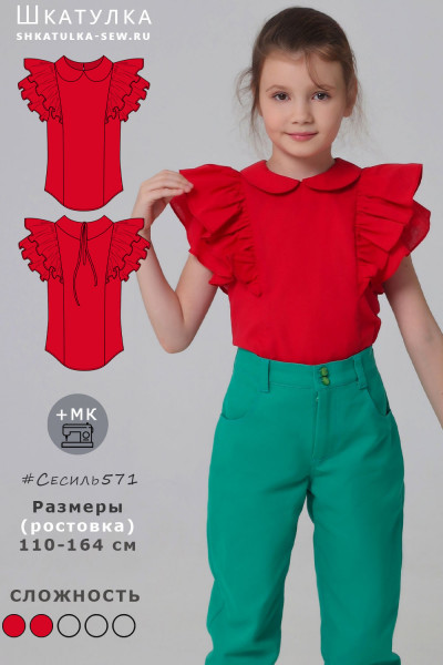 10Параметры модели: рост 129 см, обхват груди 61 см, обхват талии 57 см, обхват бедер 66 см. Выбрана выкройка 128 размера. Корректировки не выполнялись.