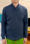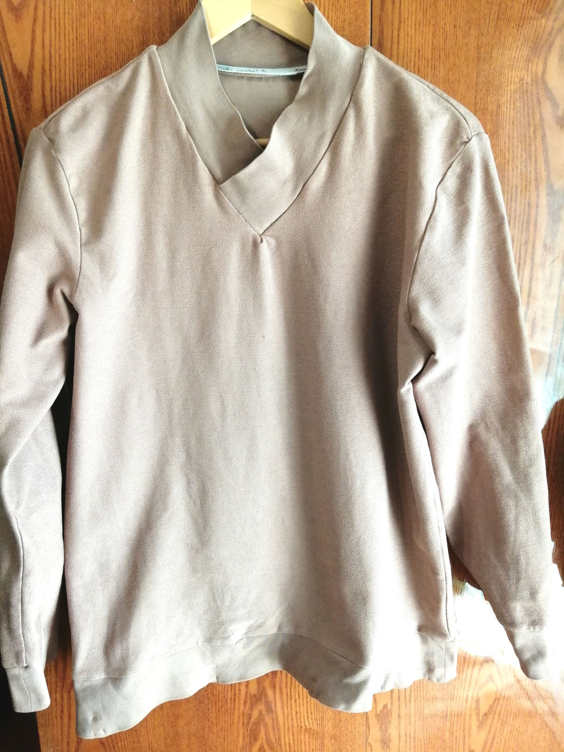 4Выкройка мужского трикотажного джемпера умеренного объёма, прямого силуэта. Перед и спинка — цельные, без особенностей. Горловина имеет V-образную форму, оформлена высоким воротником-стойкой с нахлёстом. Рукава втачные, длинные, с притачной манжетой по низу.