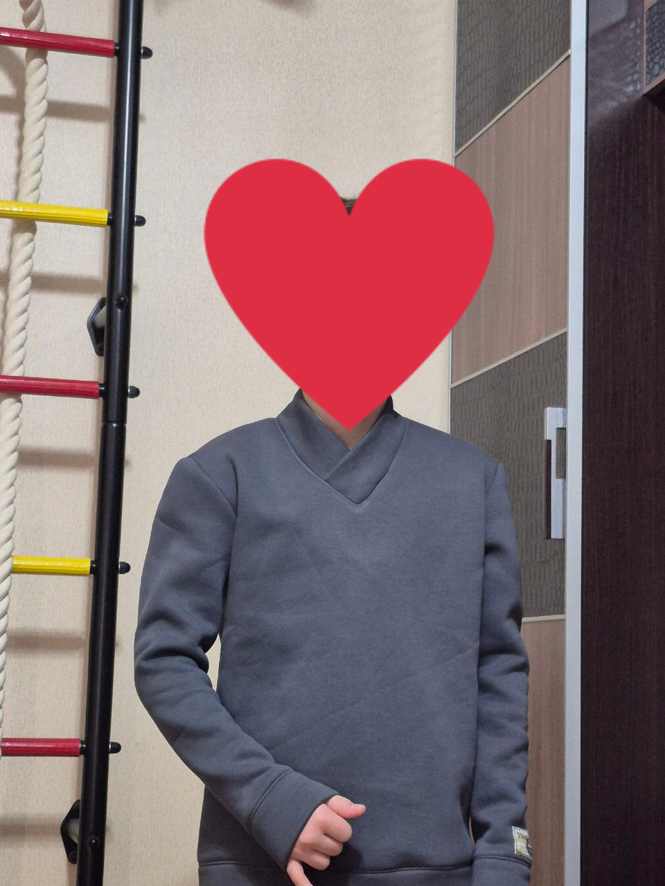 4Выкройка детского трикотажного джемпера умеренного объёма, прямого силуэта. Перед и спинка — цельные, без особенностей. Горловина имеет V-образную форму, оформлена высоким воротником-стойкой с нахлёстом. Плечо немного увеличено. Рукава втачные, длинные, с притачной манжетой по низу.