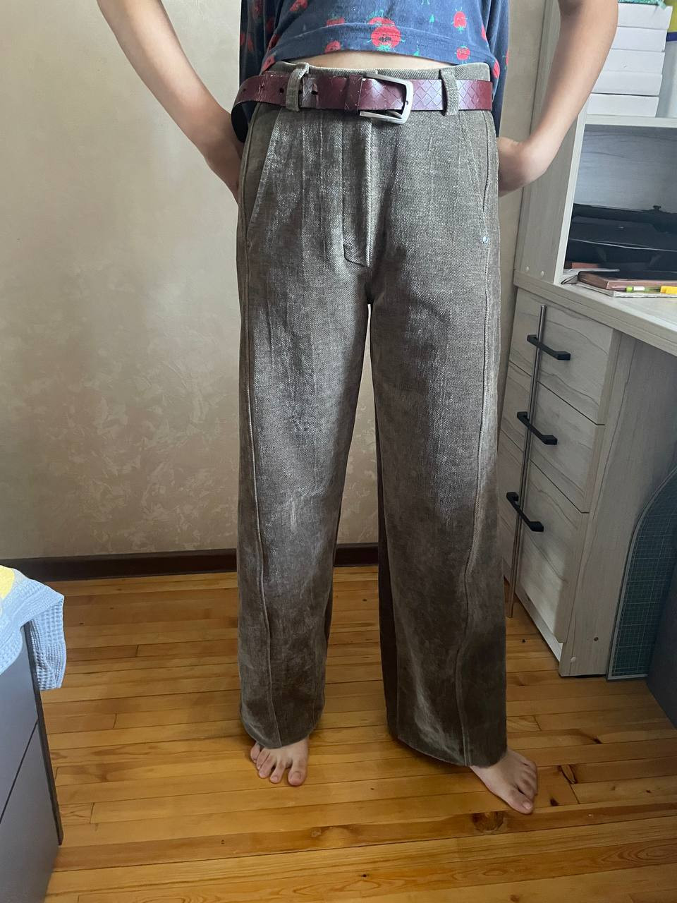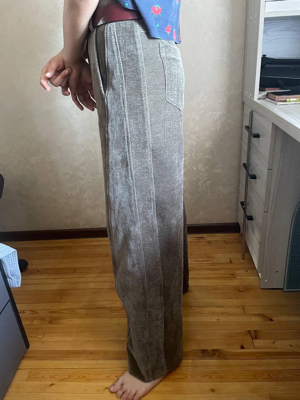 4Выкройка подростковых джинсов "багги" объёма оверсайз. Передние половинки состоят из основной детали с боковым карманом с подрезным бочком и бочка. Задние половинки состоят из основной детали с накладными карманами, расположенными в области бёдер, и фигурной кокетки. Верхний срез джинсов обработан притачным поясом со шлёвками, регулирующимся по ширине за счёт ремешков-регуляторов. Линия талии в джинсах находится на естественном месте. При расстегнутых ремешках-регуляторах получается заниженная посадка с заниженной слонкой. Застёжка джинсов - классический гульфик с молнией в среднем шве переда и обмётанная петля и пуговица на поясе.
