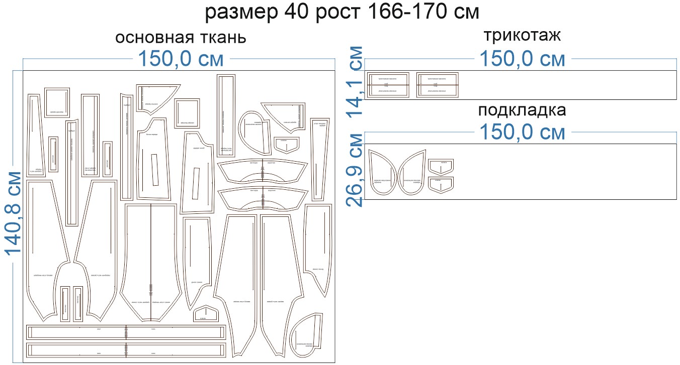 Внимание: расчет выполнен для однотонной ткани без рисунка, без учета направления ворса и возможной усадки! Усадка может достигать 15-20% от длины материала. Обязательно учитывайте это и берите с запасом.