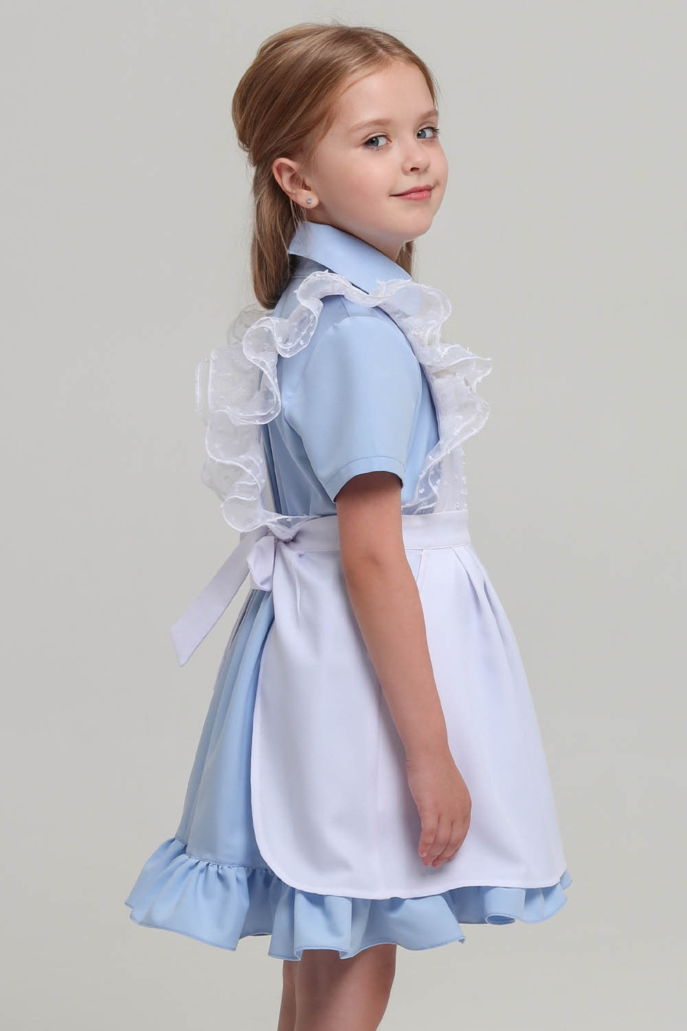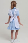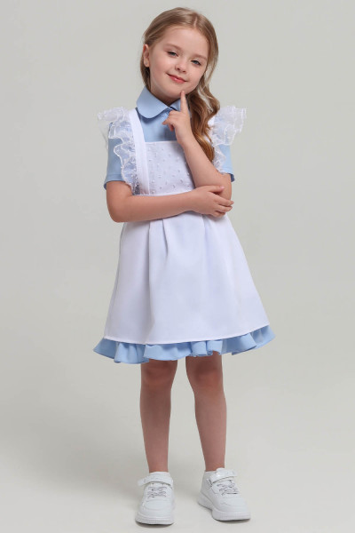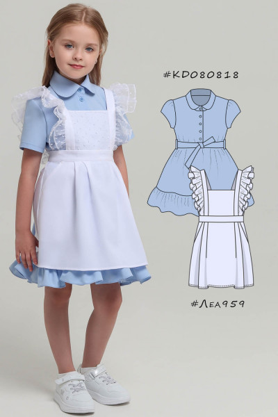 4Выкройка школьного фартука умеренного объёма, полуприлегающего силуэта. Верхняя часть фартука состоит из двойной грудки (отделочный материал + основной материал), бретелей с двойной оборкой из отделочного материала. Нижняя часть фартука состоит из передней части с боковыми карманами с подрезным бочком и защипами по верхнему срезу, и боковых частей с защипами по верхнему срезу. Верхняя и нижняя части фартука соединены между собой притачным поясом, завязывающимся на спинке.