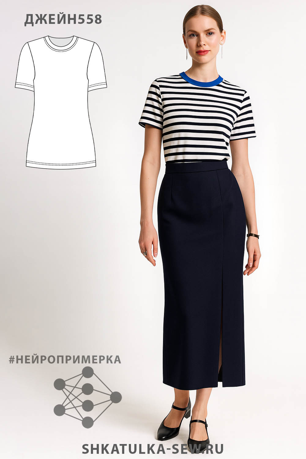 4 Выкройка футболки малого объема с круглой горловиной, обработанной обтачкой из трикотажа рибана/кашкорсе. Рукав короткий прямой.