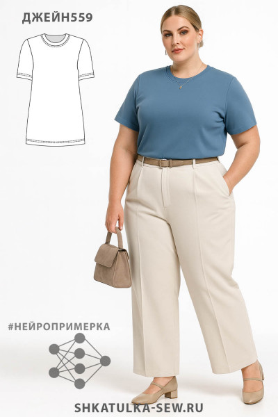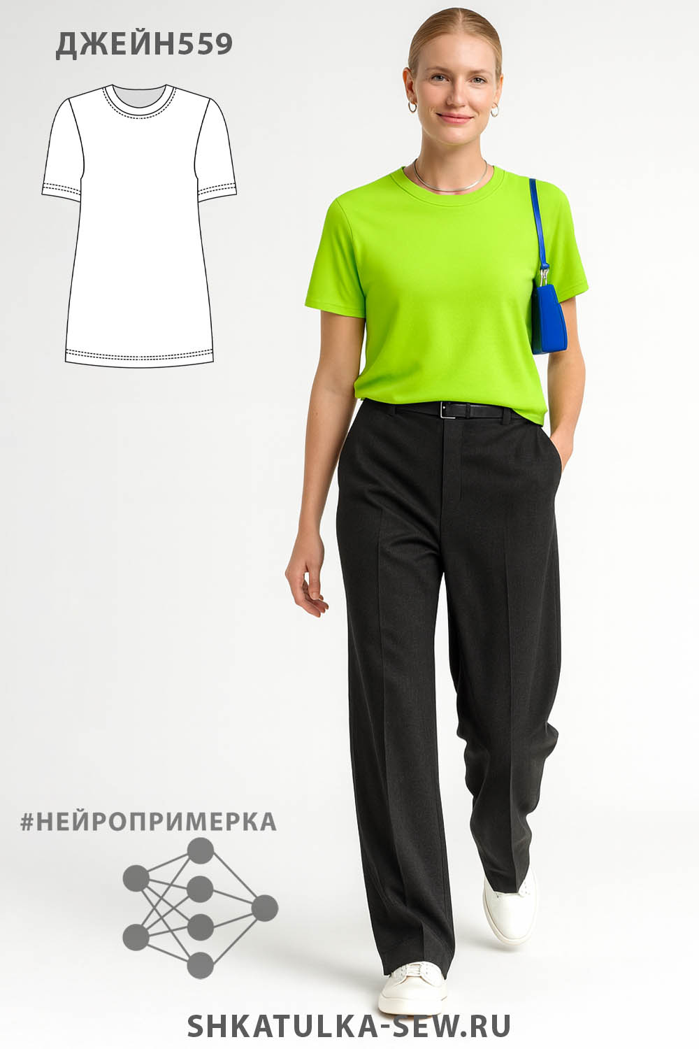 4 Выкройка футболки увеличенного объема с круглой горловиной, обработанной обтачкой из трикотажа рибана/кашкорсе. Рукав короткий прямой.